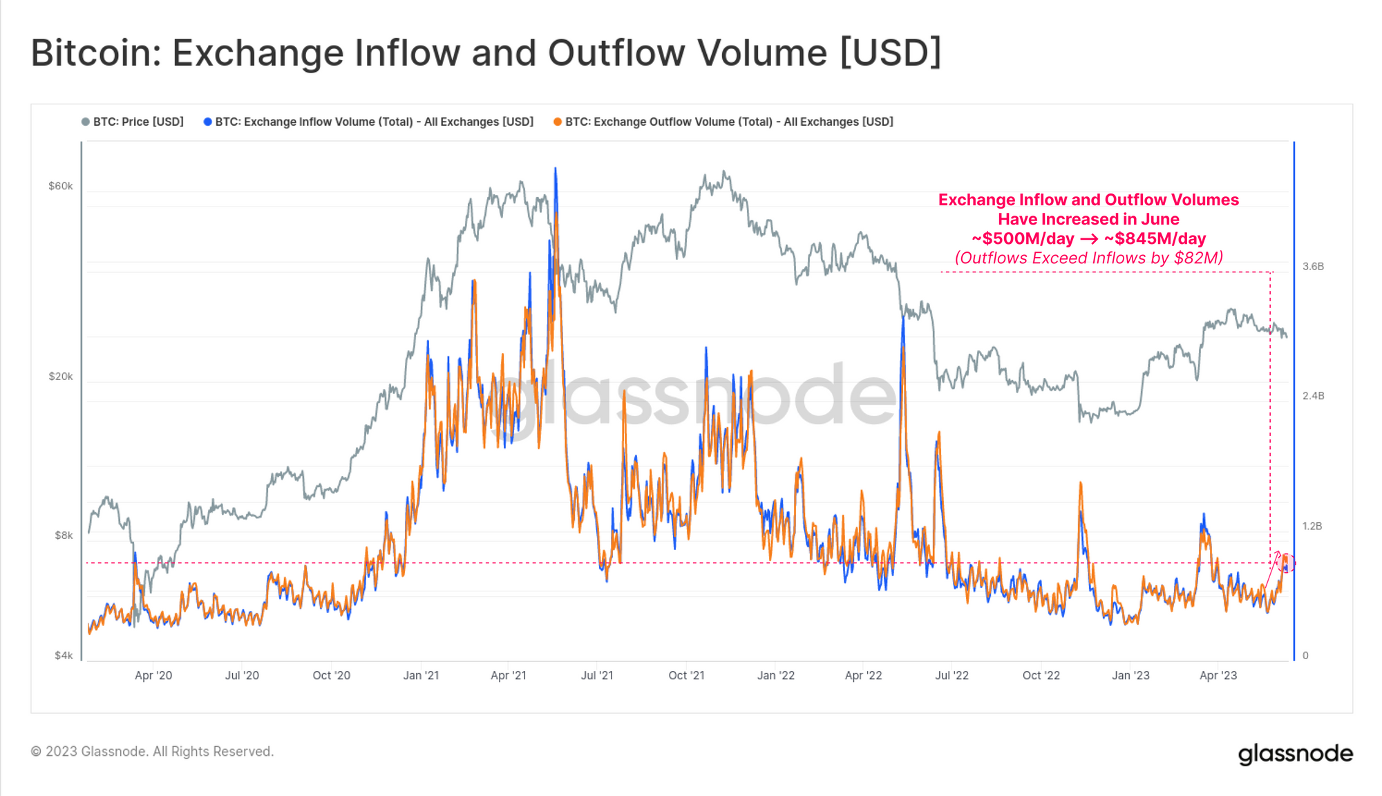 The chart below overlays BTC exchange deposit and withdrawal volumes, demonstrating how flows in both directions tend to track each other very closely. This week was no exception, with flows in, and out increasing by around 70% to $845M/day.