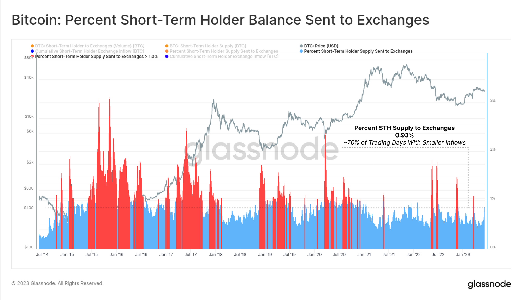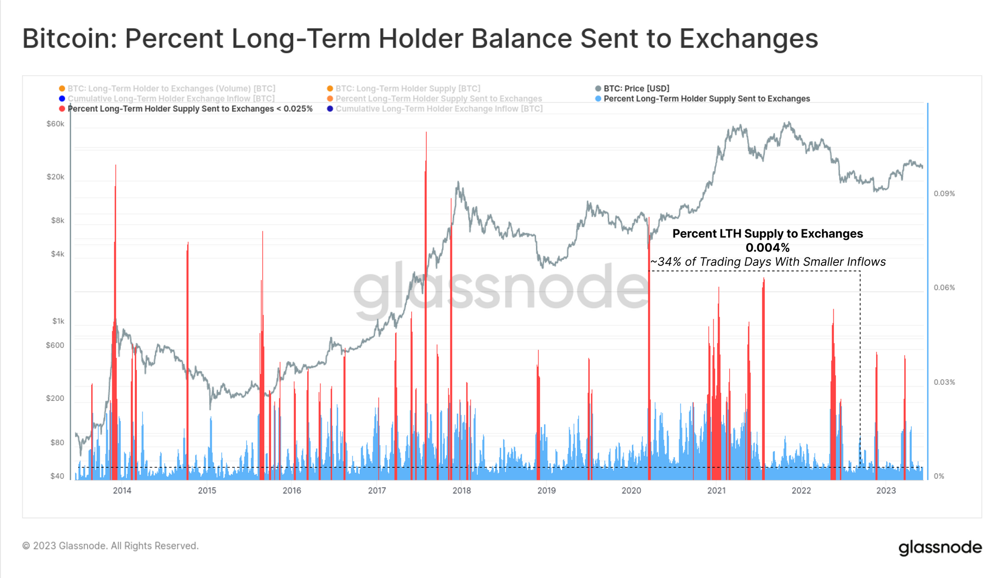 Bitcoin Long-Term Holders on the other hand are remarkably calm, displaying no discernible reaction to the news. Their exchange inflow volume this week was just 0.004% of their total holdings, with 66% of all trading days seeing a larger relative inflows.