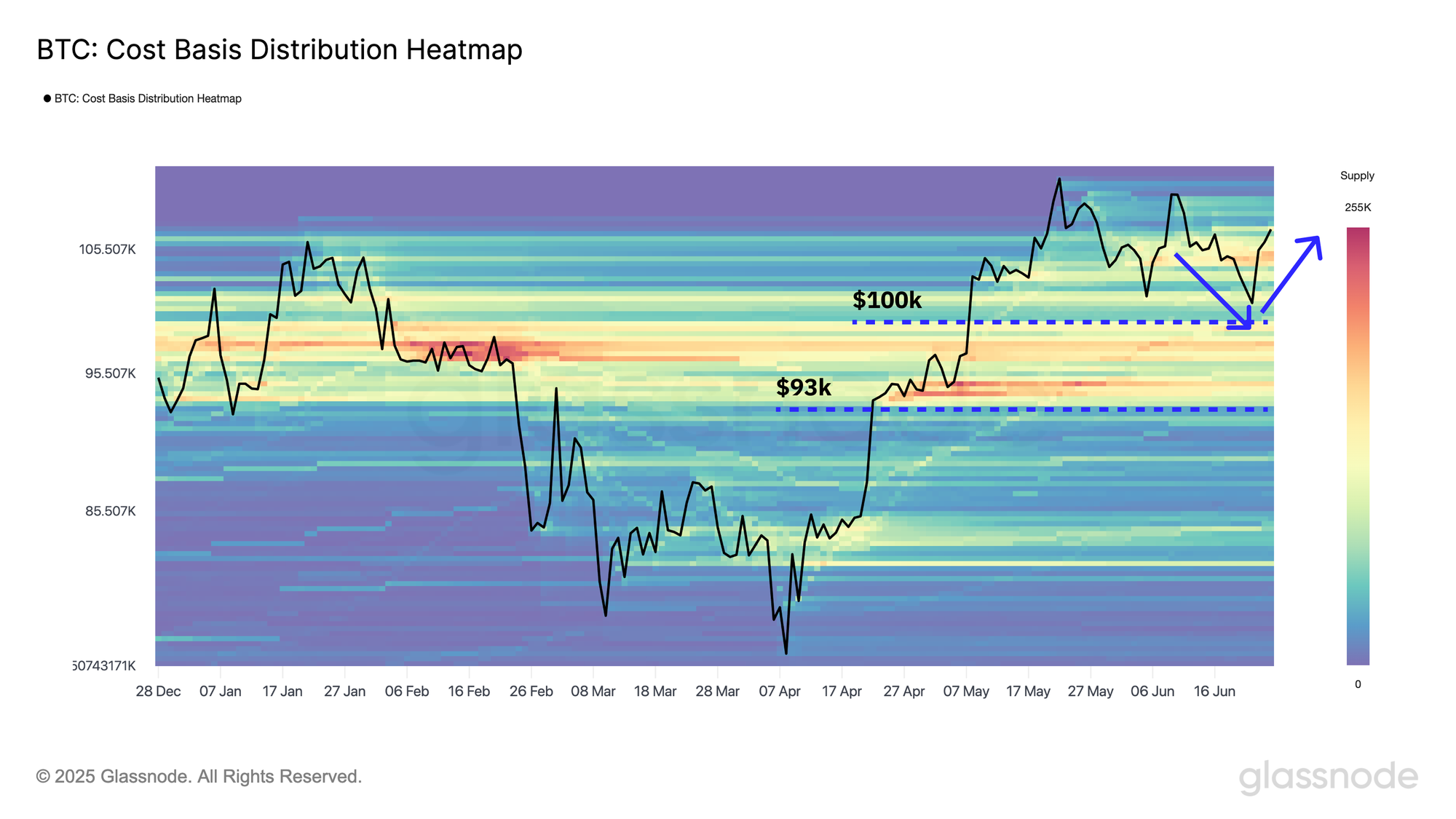 현재 가격은 5월 초 이후 줄곧 유지돼온 $100,000~$110,000 구간 내에서 박스권 흐름을 이어가고 있습니다. - $93,000~$100,000, 강력한 지지선으로 작용 중 : CBD 히트맵에 따르면, 2025년 1분기 동안 이 가격대에서 매수세가 집중되며 두터운 매물대가 형성됐습니다. 이 지지 구간 위에서 가격이 유지되는 한, 중기적인 상승 추세는 유효하다고 볼 수 있습니다.