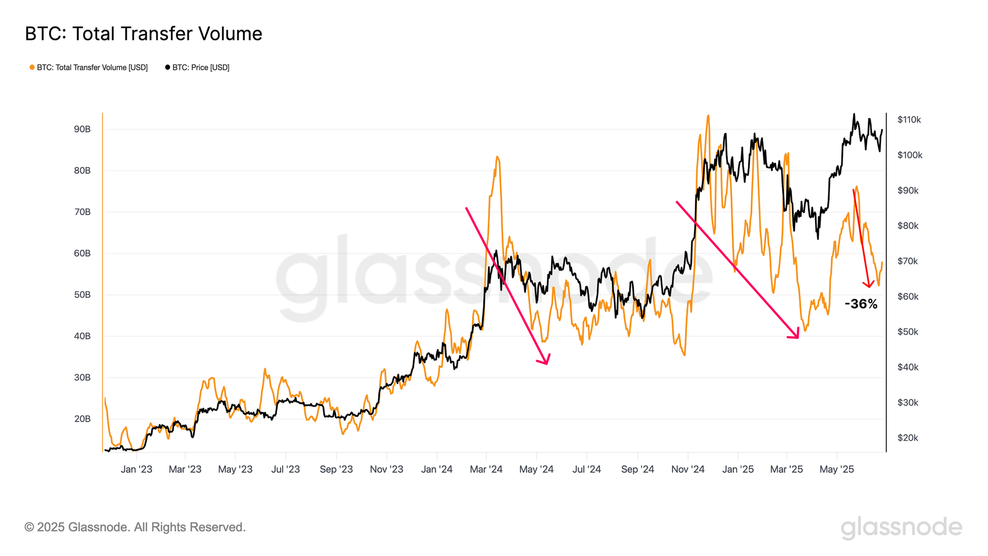 주요 활동 지표 전반에서도 비슷한 과열 완화 흐름이 나타나고 있습니다. 온체인 전송량의 7일 이동평균은 5월 말 760억 달러에서 최근 주말 기준 520억 달러로 약 32% 감소했습니다.