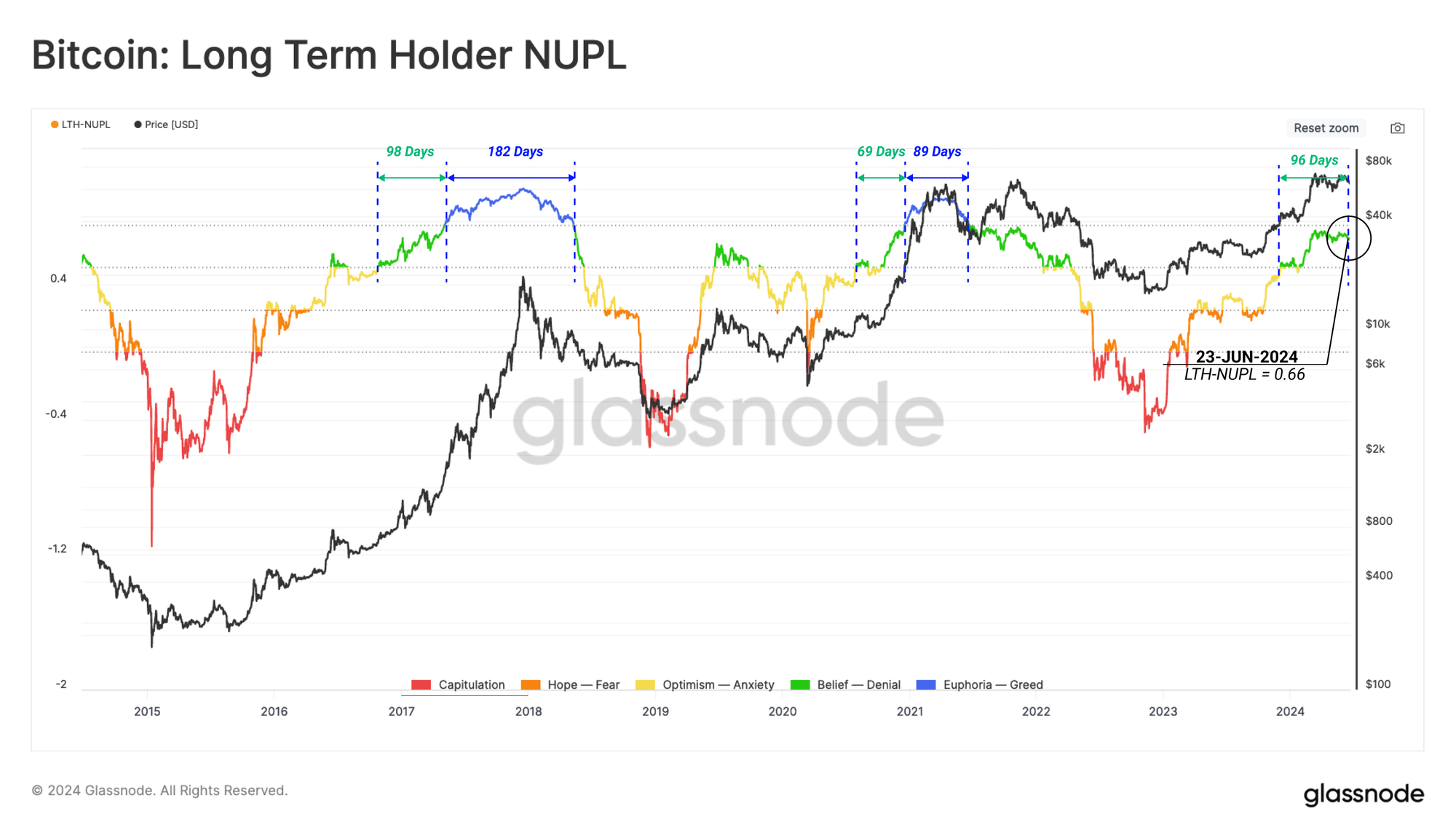 At the time of writing, LTH-NUPL is at 0.66, which resides between levels associated with the pre-euphoria phase 🟢. This condition has been in play for 96-days, which is a very similar duration to the 2016-17 cycle.