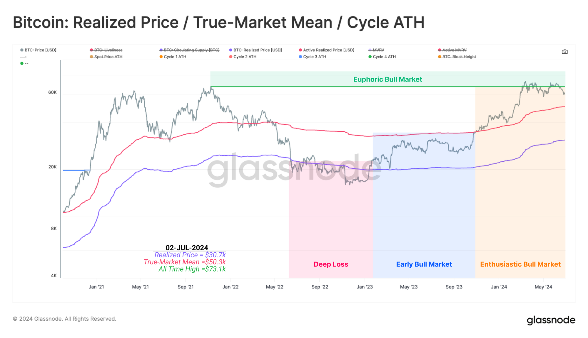 - 🔵 Early Bull Market: Prices trade between Realized Price and True Market Mean.