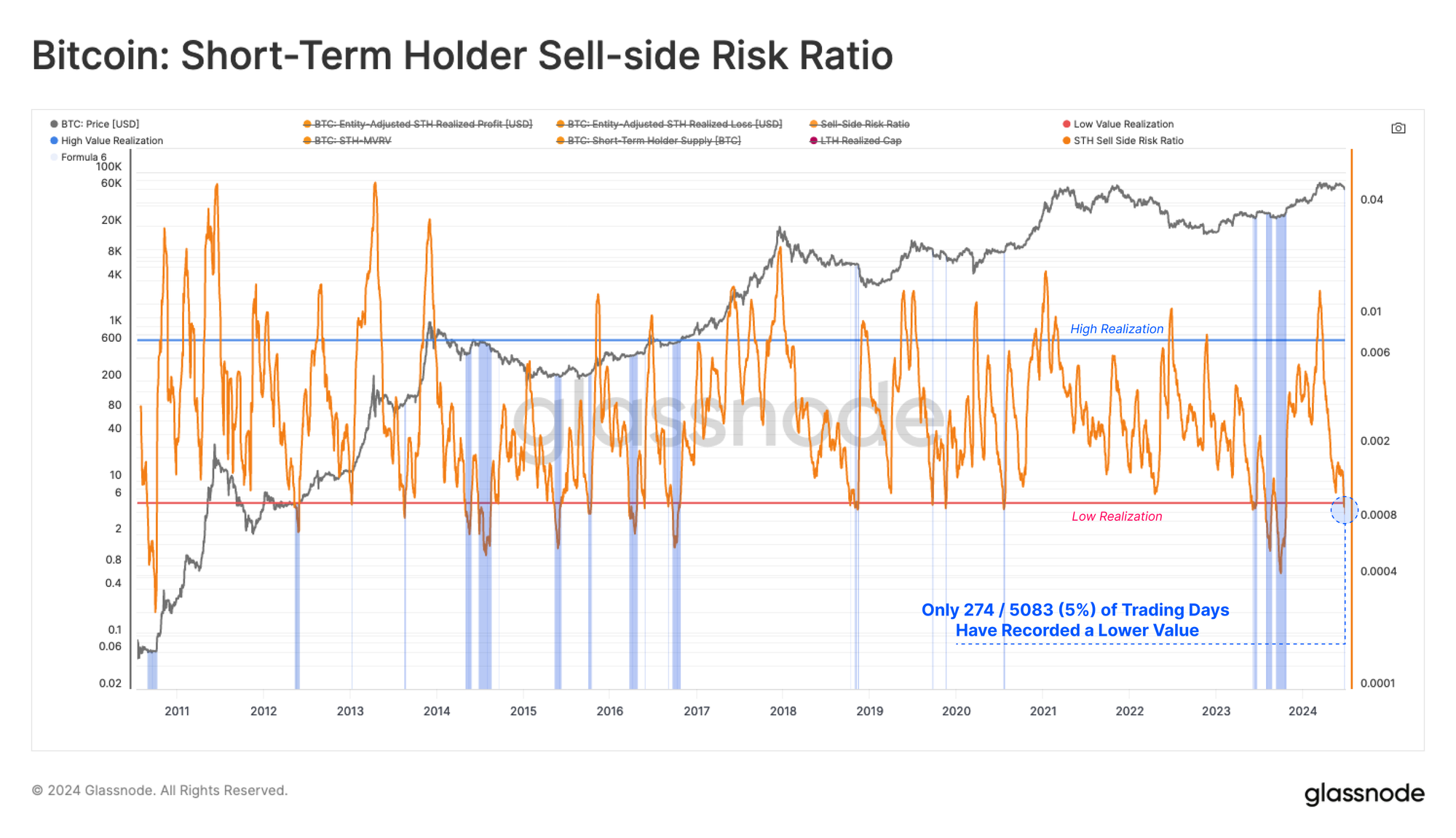 Notably, the STH Sell-Side Risk has contracted to historic lows, with only 274 out of 5083 trading days (5%) recording a lower value. This suggests that a degree of equilibrium has been established during this price consolidation, and alludes to heightened volatility expectations in the near future.