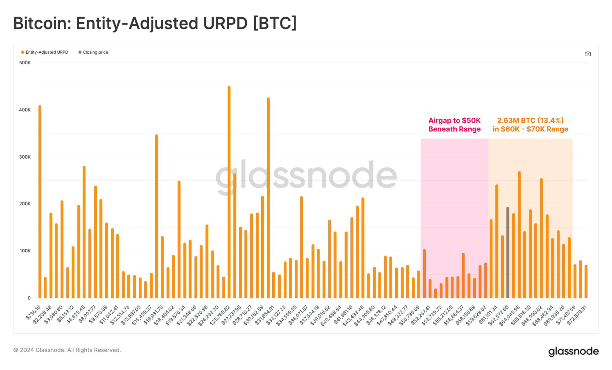 With 2.63M BTC (13.4% of the circulating supply) located within the $60k to $70k cluster, small price fluctuations are able to substantially affect the profitability of coins and investor portfolios.
