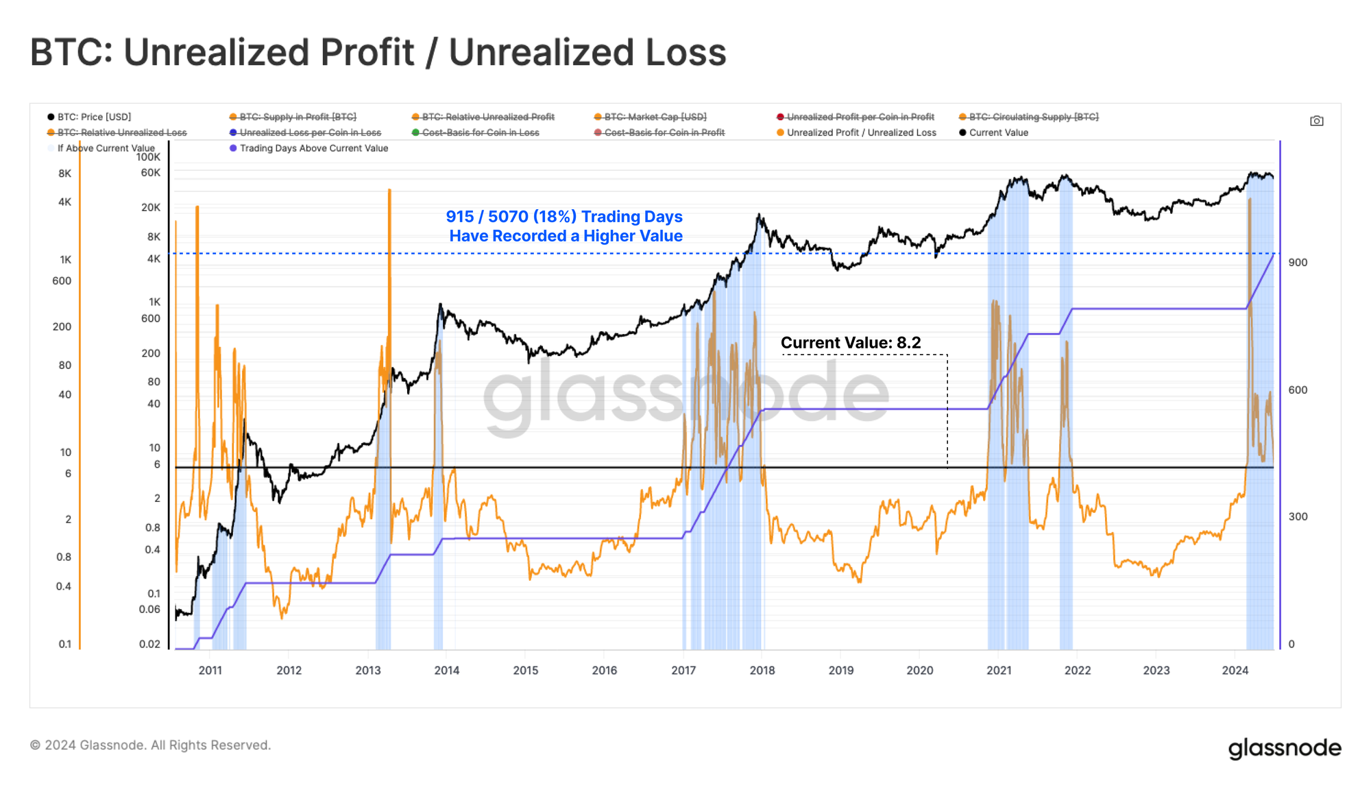 If we look at the ratio between the unrealized profit/loss per coin, we can see that the magnitude of paper gains held is 8.2x larger than paper losses. Only 18% of trading days have recorded a larger relative value, all of which are within Euphoric bull market regimes.