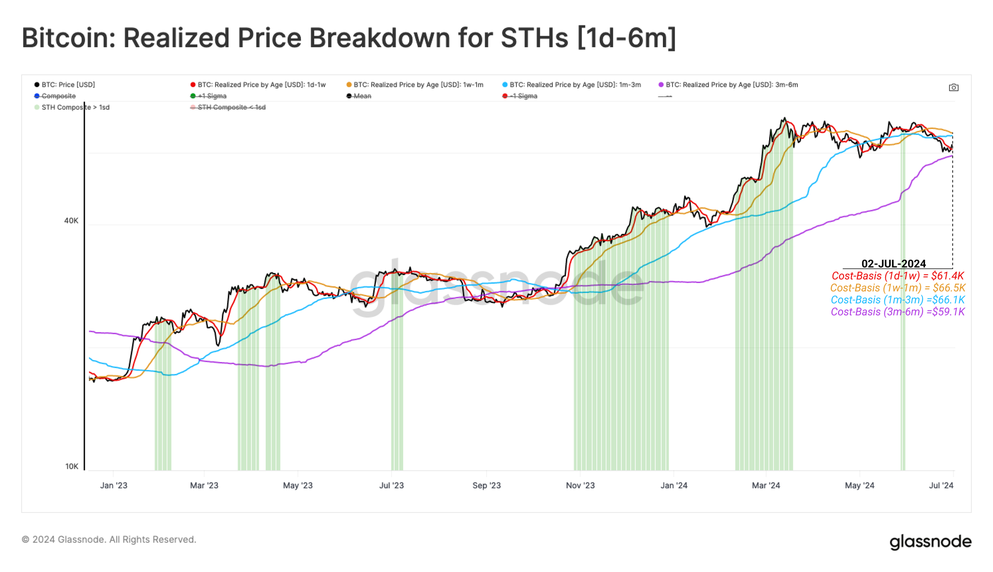 We can use the URPD metric to further assess concentrations of supply around particular cost basis clusters. Currently, the spot price is near the lower bound of a large supply node between $60k and the ATH. This aligns with the cost basis models of Short-Term Holders.