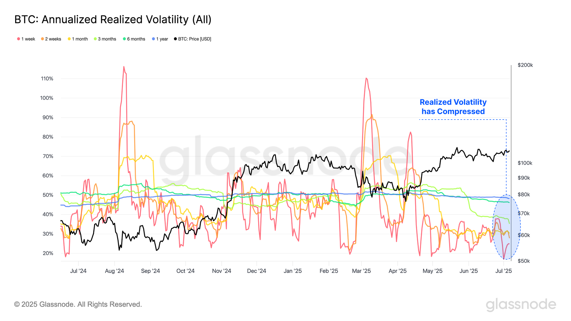 Starting with Realized Volatility measured across multiple time-frames, we observe a prolonged contraction in volatility over recent weeks, as Bitcoin continues to coil within a narrow consolidation range. Historically, such volatility compressions have preceded significant market moves, and served as early indicators of an impending phase of heightened volatility.