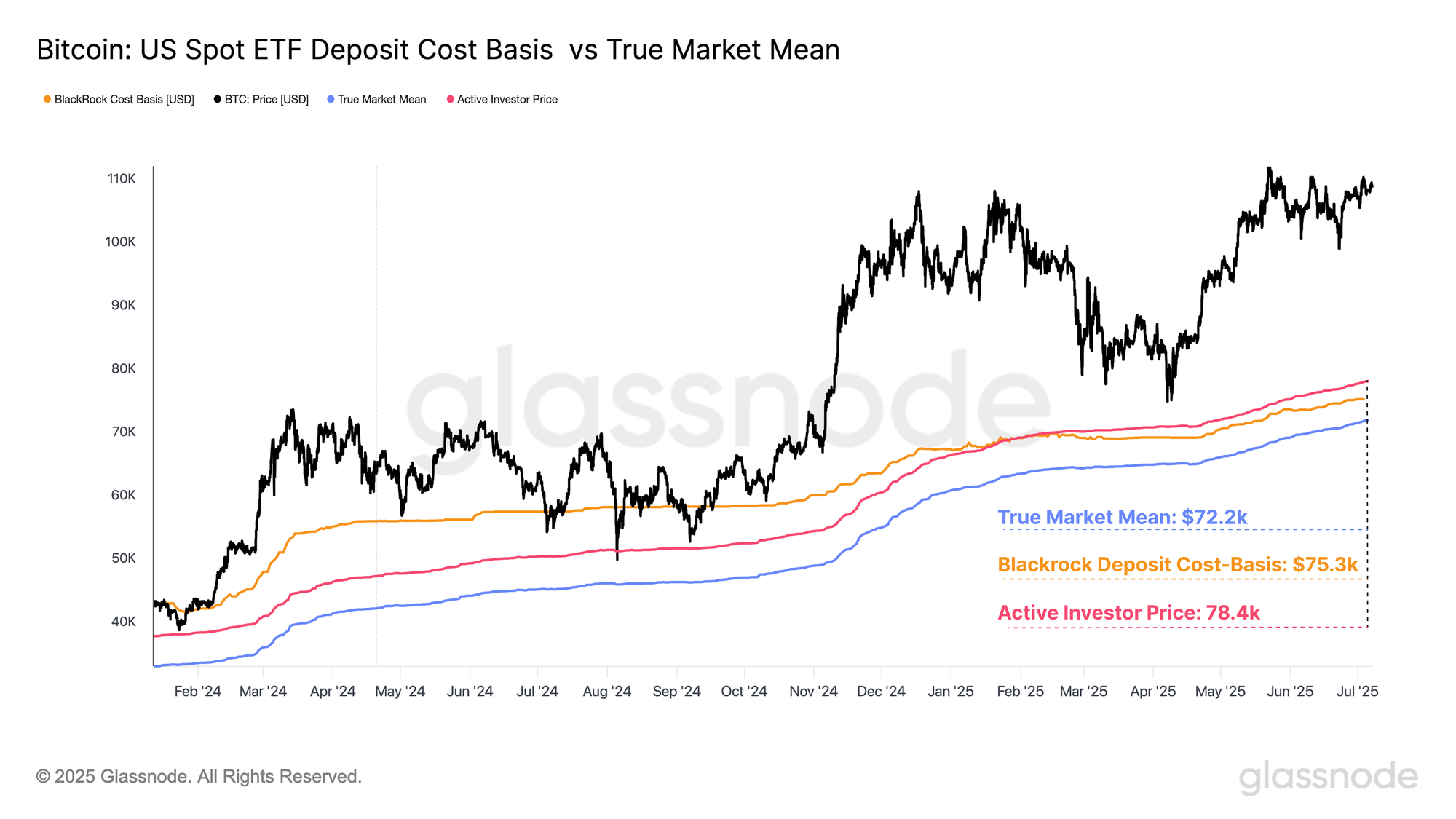When overlaying the BlackRock Deposit Cost Basis with the True Market Mean and the Active Investor Price (both models designed to estimate the average cost basis of investors actively participating in the current cycle), we can observe a striking similarity among these cost-bases.