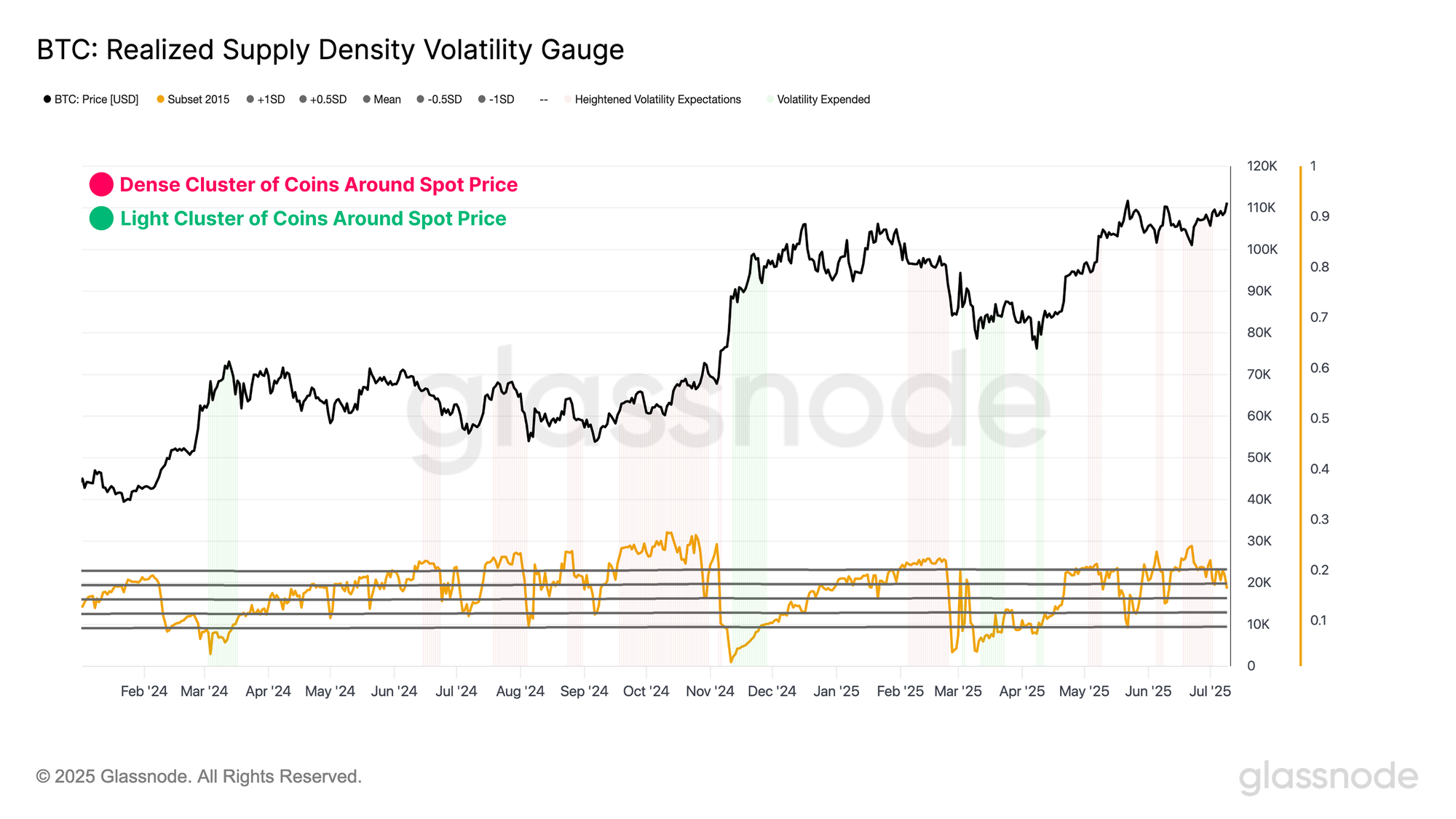From an on-chain perspective, the Realized Supply Density metric offers insight into how much of the circulating supply is concentrated within a ±10% band of the current spot price. When supply is heavily clustered around the current price, even modest market moves can sharply shift investor profitability, thereby amplifying volatility.
