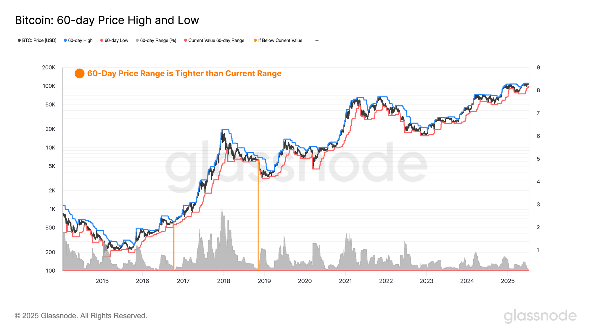 Notably, only 6% of trading days have recorded a tighter 30-day range than the current one, underscoring the exceptional degree of volatility compression presently occurring in the spot market.