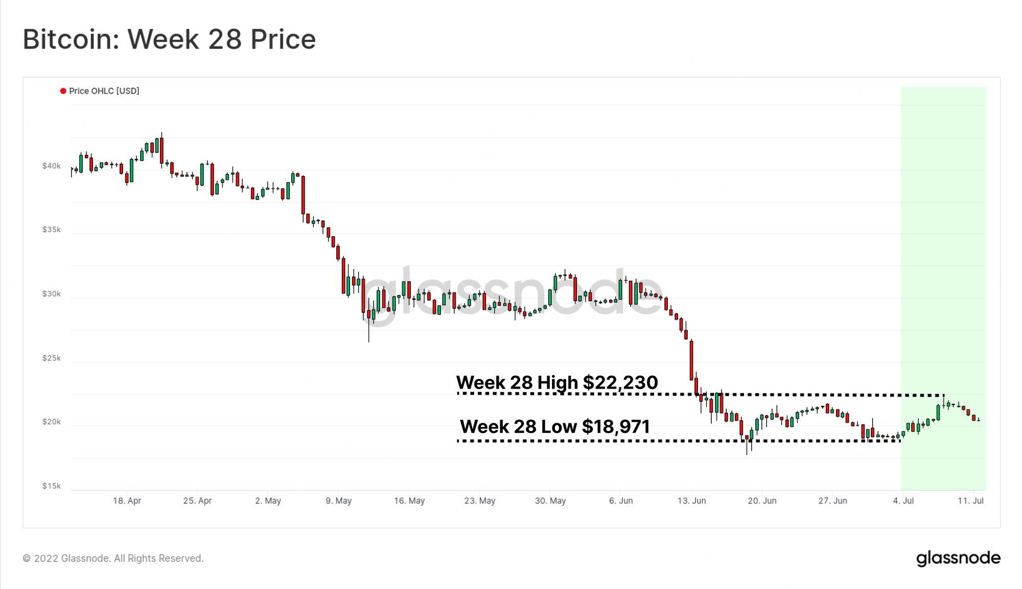 Bitcoin prices continue to consolidate around the $20k range this week, as the market digests the extreme downside volatility of June. Prices traded higher, opening at a weekly low of $18,971, and peaking at $22,230.