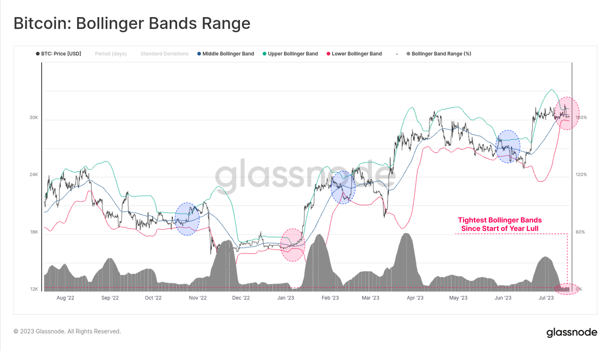 The digital asset market continues to see remarkably little volatility, with the classic 20-day Bollinger Bands experiencing an extreme squeeze. Despite setting a temporary yearly high of $31.7k this week, the rally failed to sustain momentum, bringing BTC prices back into the sideways trading range above $30.0k.
