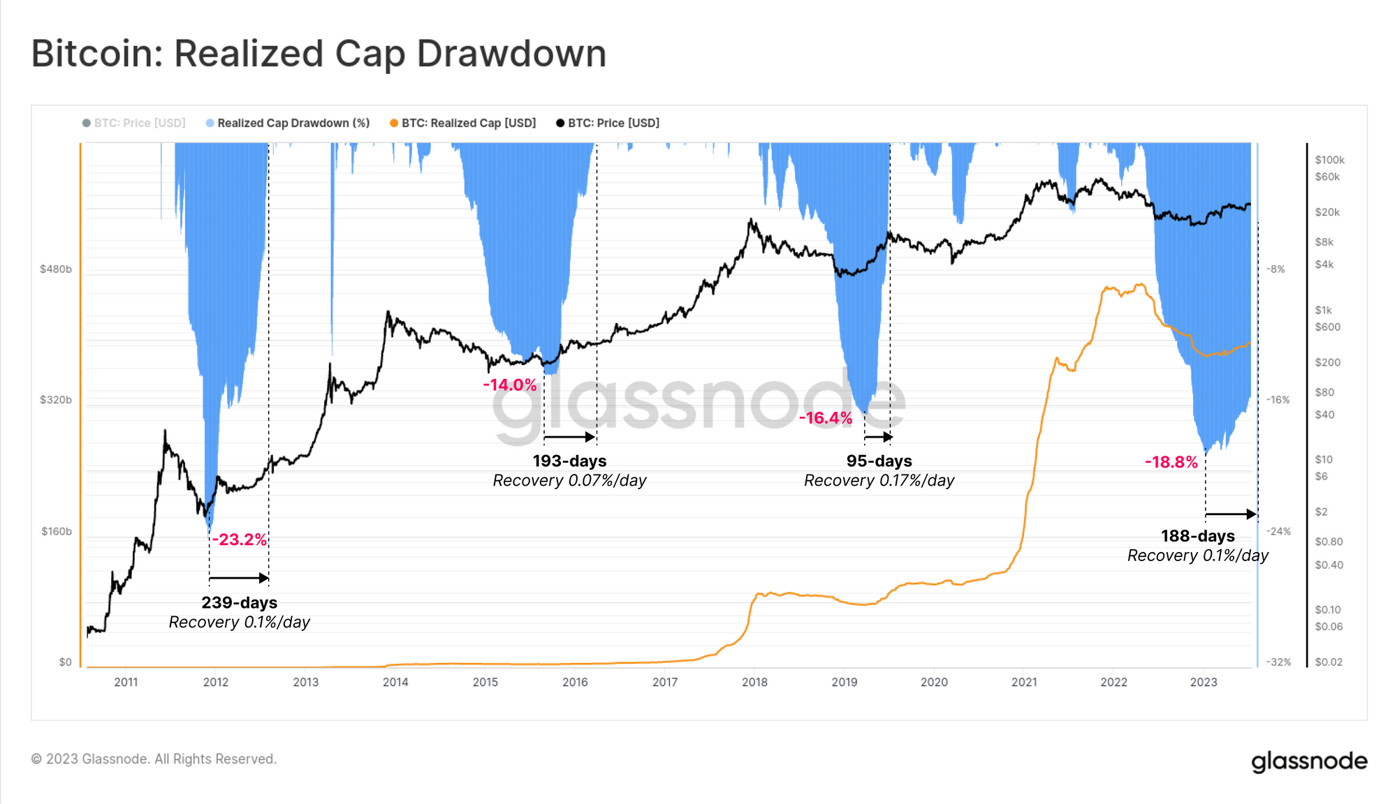 During bear markets, Bitcoin usually experiences significant capital outflows, as investors lock in losses. The realized cap drawdown in 2022 reached the second deepest value of -18.8%, demonstrating the magnitude of the bear market. Recovery of the realized cap ATH in prior cycles have taken between 95 and 239-days, with the recovery so far occurring at a similar rate.