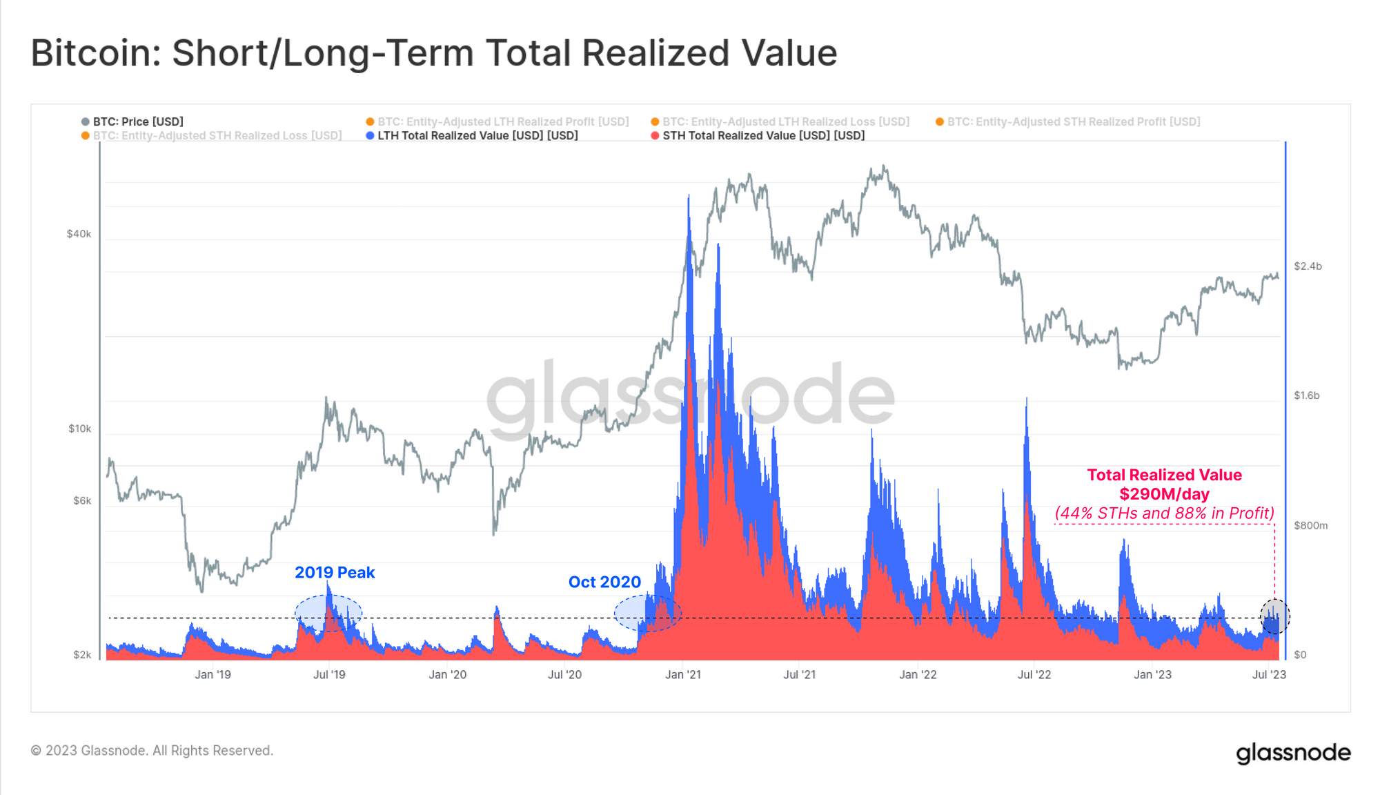 If we breakdown the realized value locked in by the market, we can see the strength of the 2023 recovery thus far. Both LTHs and STHs are now seeing the super-majority (73%) of their spending locking in a profit.