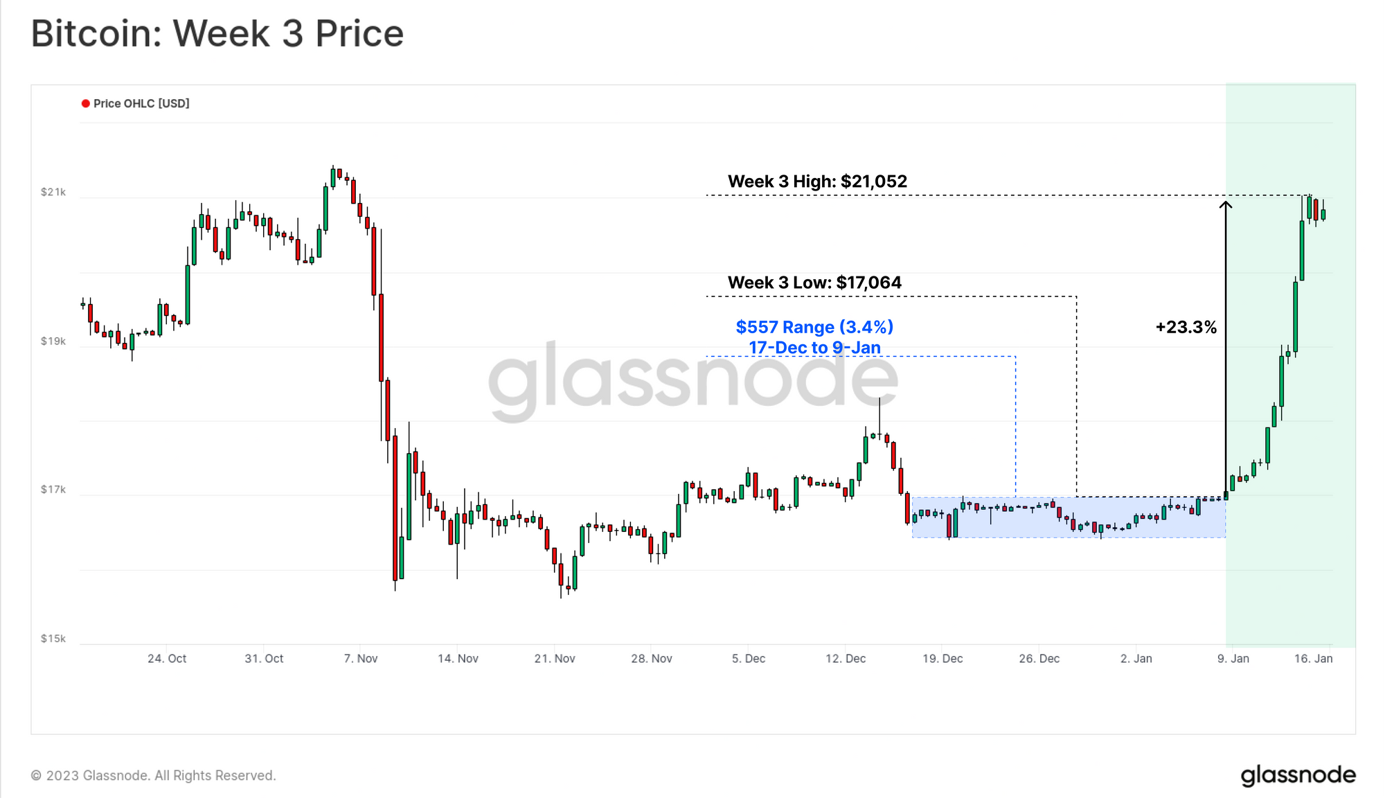 After one of the least volatile periods in Bitcoin history (WoC 2), the market pulled off a remarkable and explosive 23.3% rally this week. BTC prices rallied from a weekly low of $17k to over $21k, breaking through several widely observed technical and on-chain pricing models. Many of these models tend to act as significant psychological resistance levels during bear markets, which makes this particular event noteworthy.