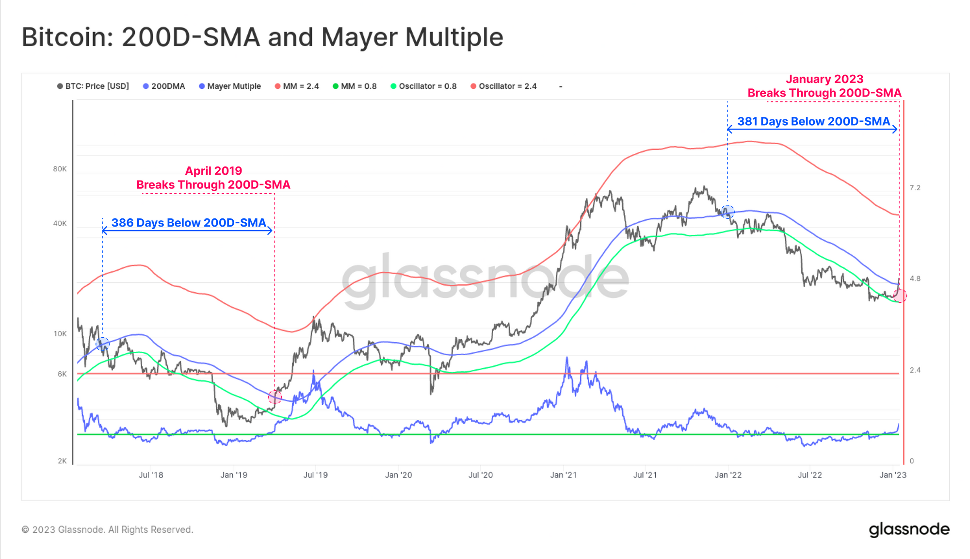 With this weeks powerful rally, the market overcame this psychological level at $19.5k. Bitcoin markets often express a strangely consistent cyclical behavior, with this cycle trading below the 200D-SMA for 381-days, which is just 5-days shy the 2018-19 bear market at 386-days.