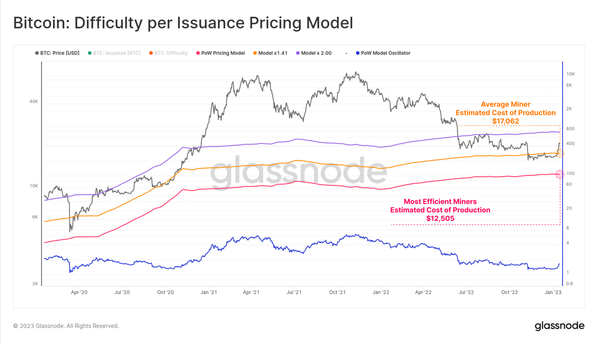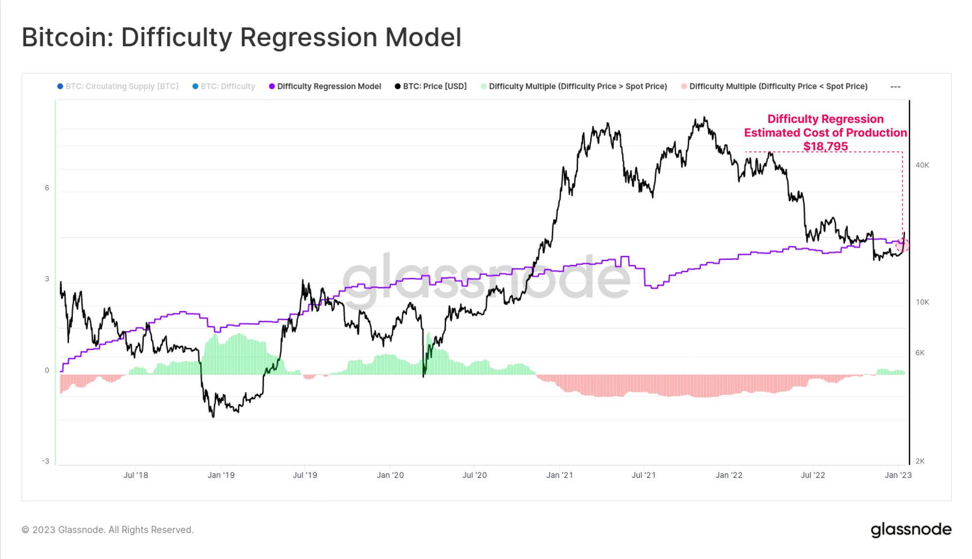 The model below estimates the average cost of BTC production at $18,798, under the assumption that Difficulty reflects the ultimate 'price' of the mining sector.