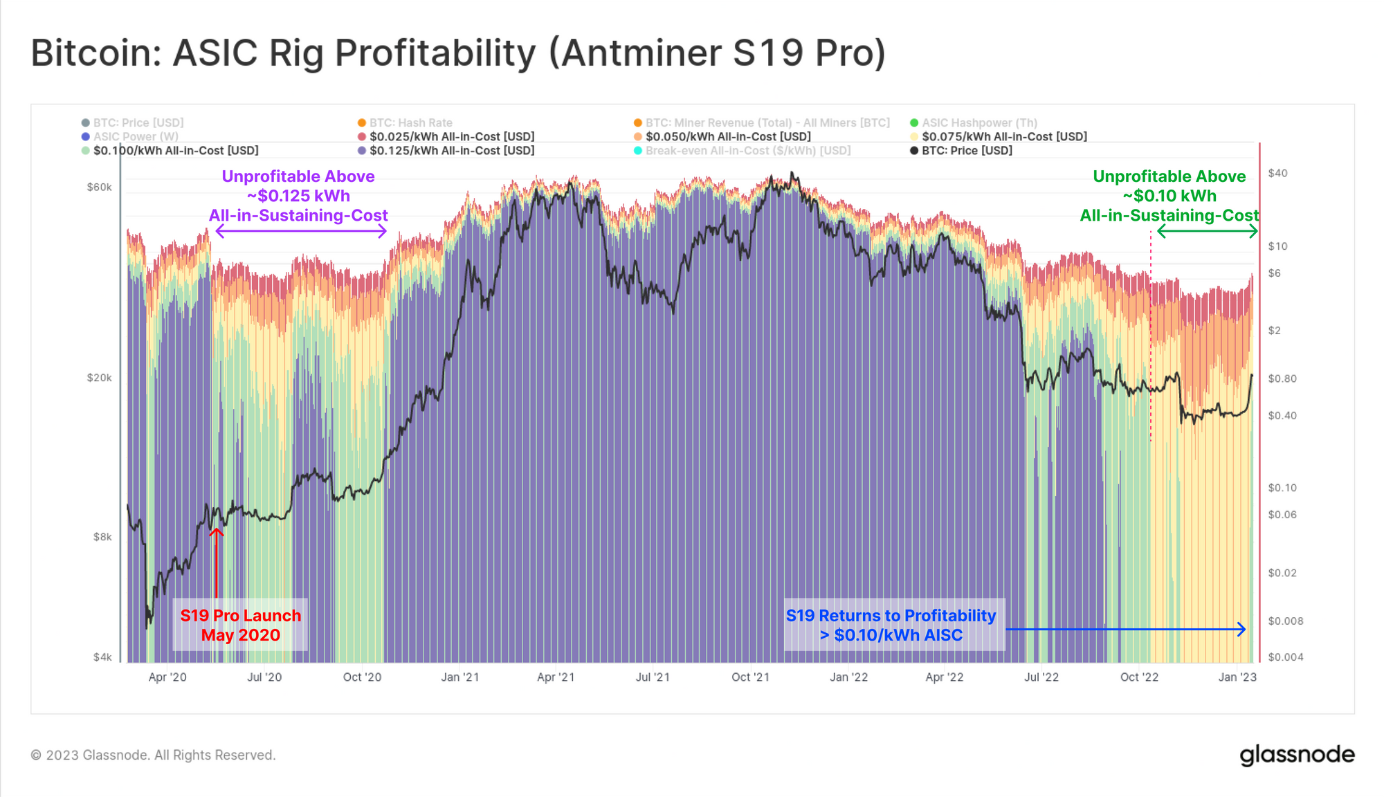 With the chart shown in log-space, periods where this rig is estimated to be unprofitable will show up as gaps in the relevant color plot. Two such periods are clear, being May to Oct 2020 (immediately after the rig release, and halving event), and again from July 2022 until this week. Via this model, the S19 Pro is estimated to have been unprofitable for any miner operating at an AISC over ~$0.10/kWh for the last seven months.