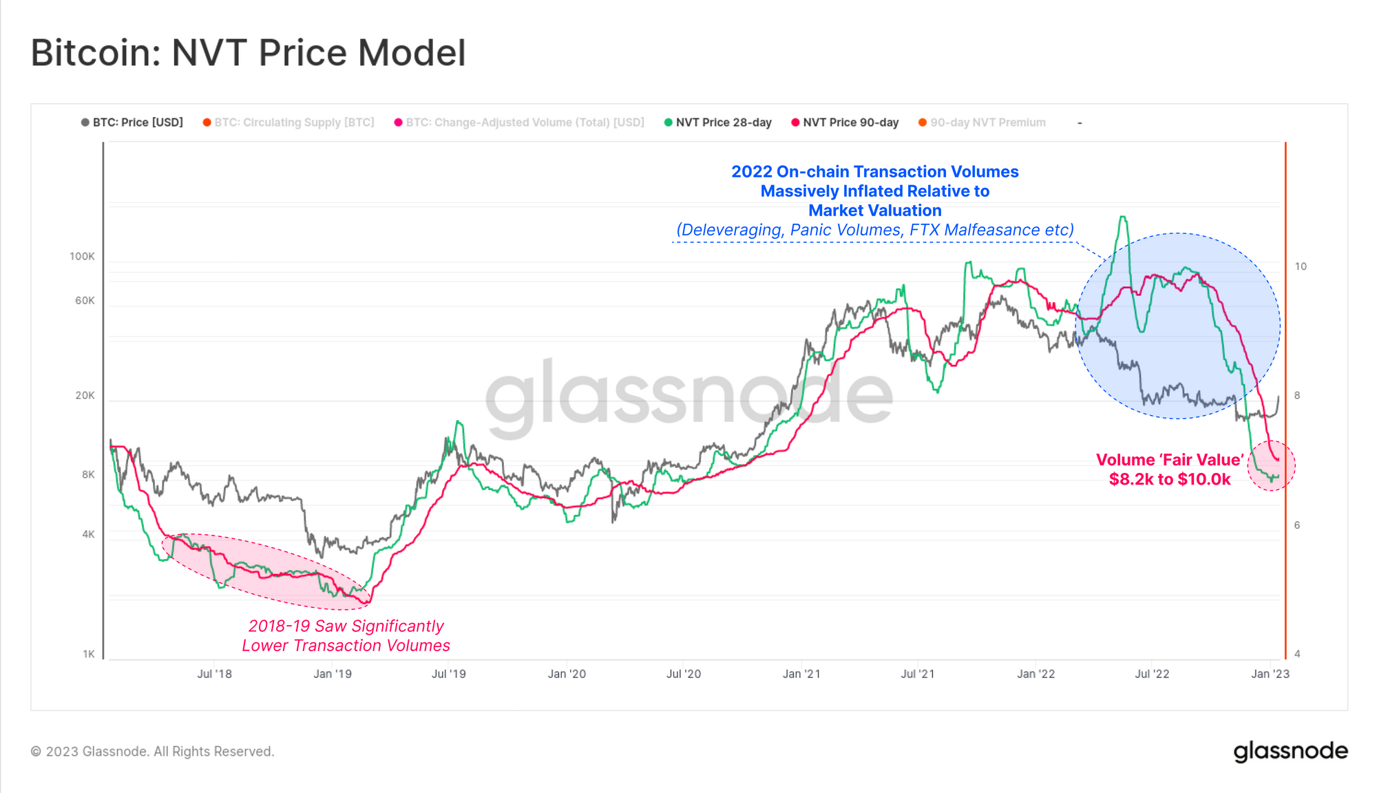 - The model greatly over-estimated Bitcoin fair value in 2022. In hindsight, this is likely a result of volumes sourced from large entities undergoing massive deleveraging events, but also with an unfortunate component of wallet (mis)management by the FTX/Alameda entities in their final days.