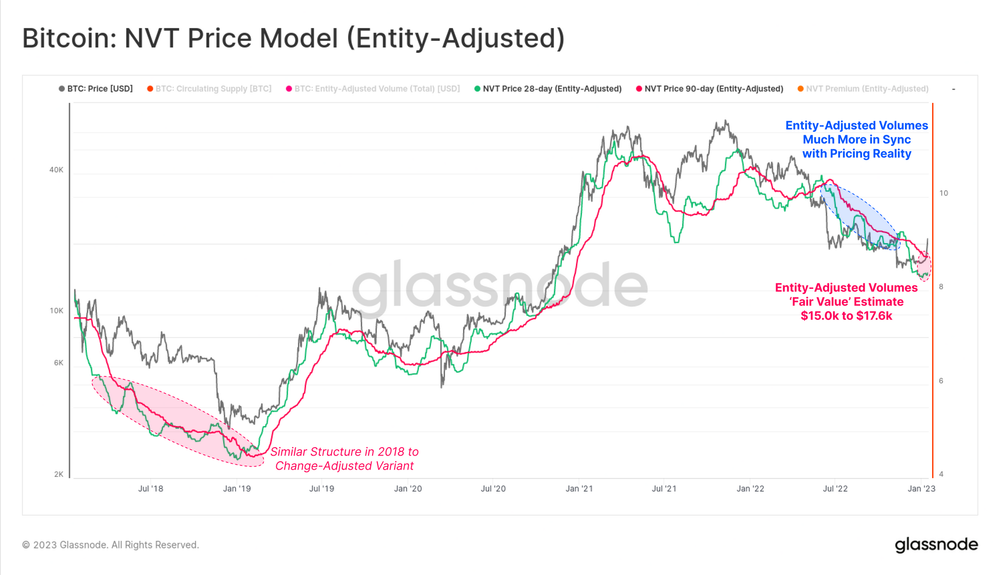 However, with the benefit of glassnode's entity-adjustment algorithms, we can achieve a more accurate representation of true economically meaningful transfer volume, and thus derive a much cleaner NVT Price model, with a visibly stronger relationship to price.