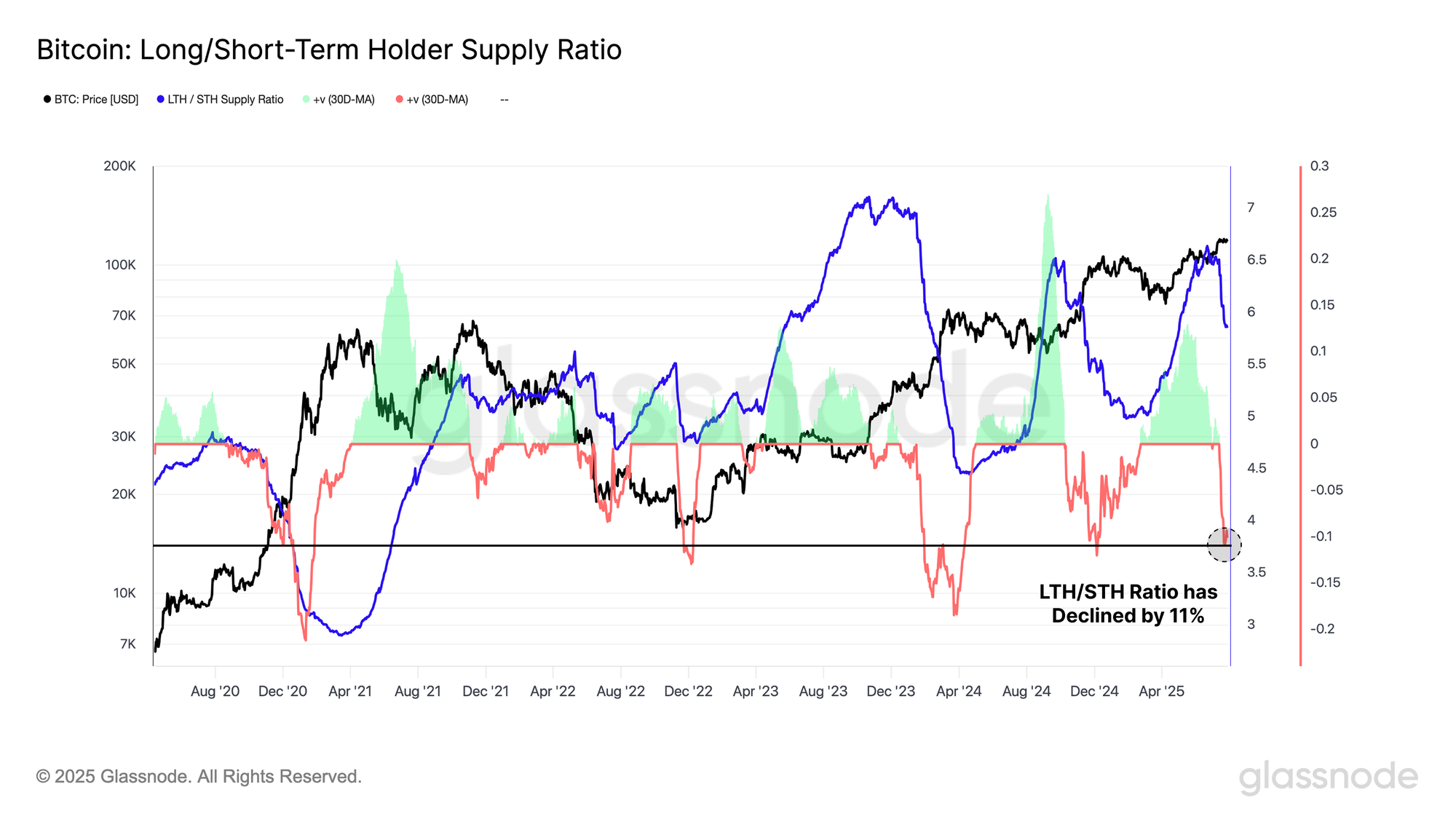 Currently, this distribution phase remains underway, as the LTH/STH supply ratio continues to contract. Over the past 30 days, the ratio has declined by -11%, with only 8.6% of trading days registering a more severe drawdown, underscoring the intensity of the shift in investor behavior.
