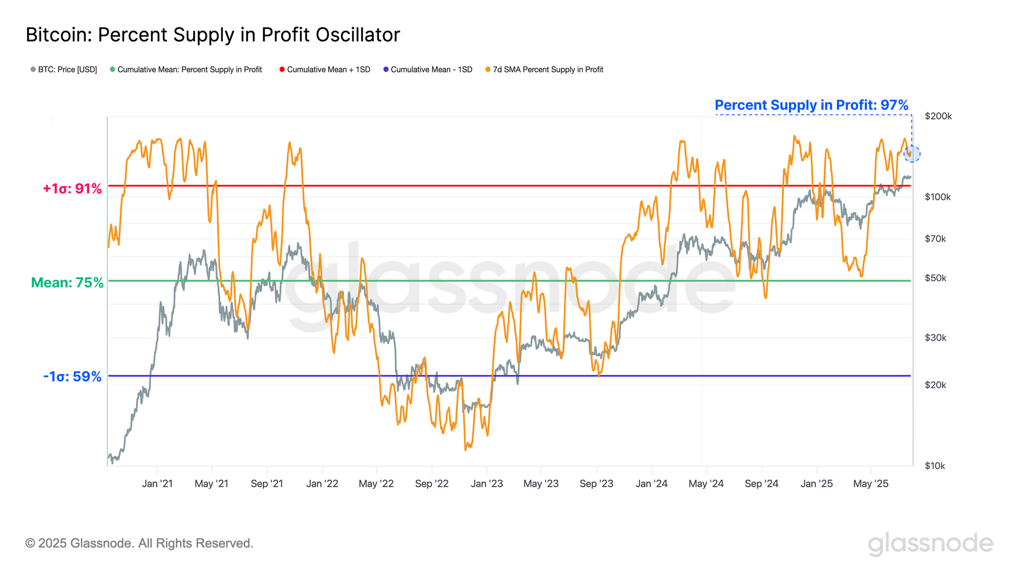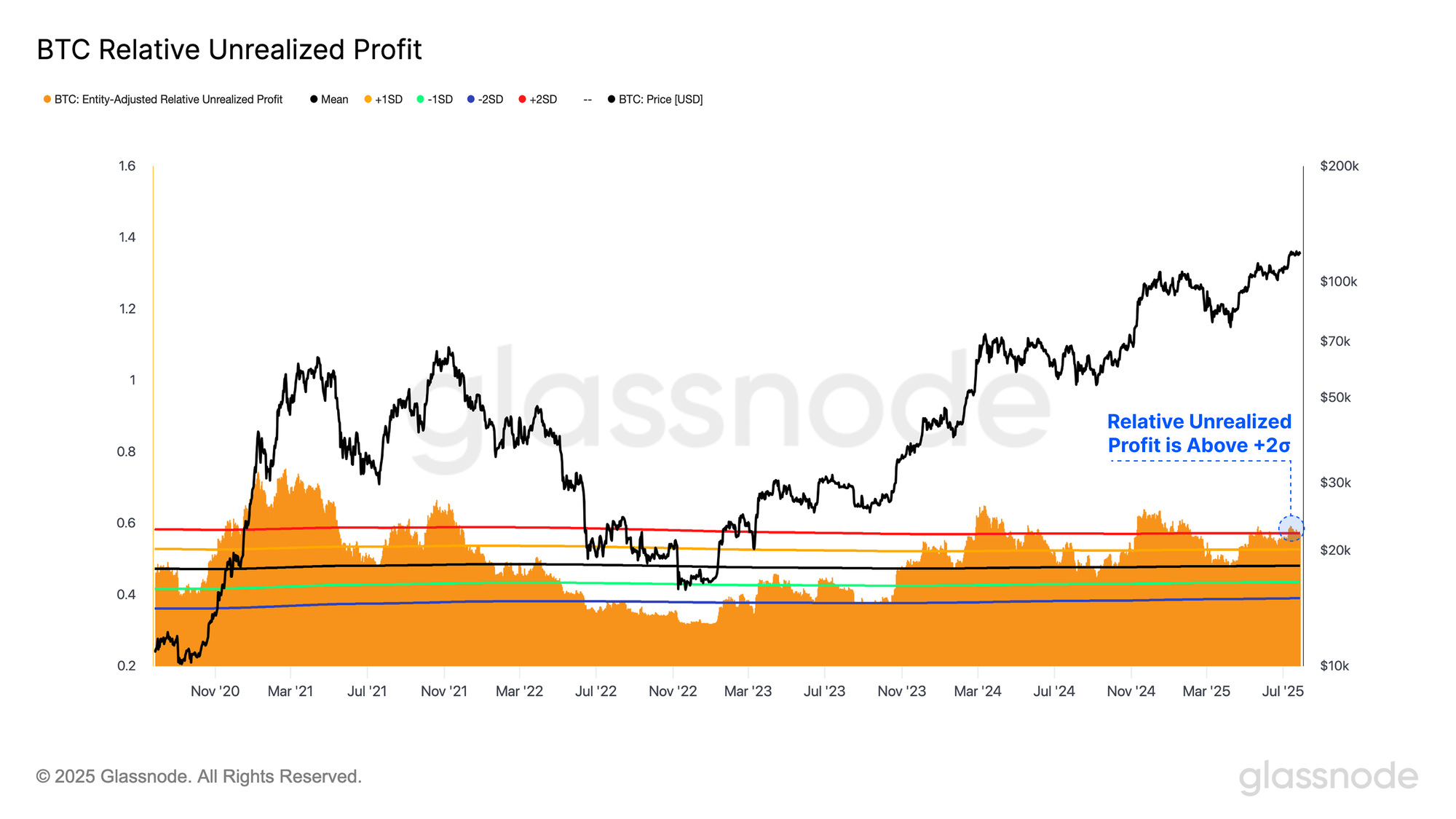 However, interpreting this signal requires nuance. While extreme profit-taking can coincide with price tops, as observed at the $73K all-time high in March 2024, this isn’t always immediate. For example, during the $100K breakout in late-2024, profit-taking peaked when the price was at $98K, however the market continued to climb another 10% before finally peaking at $107K.