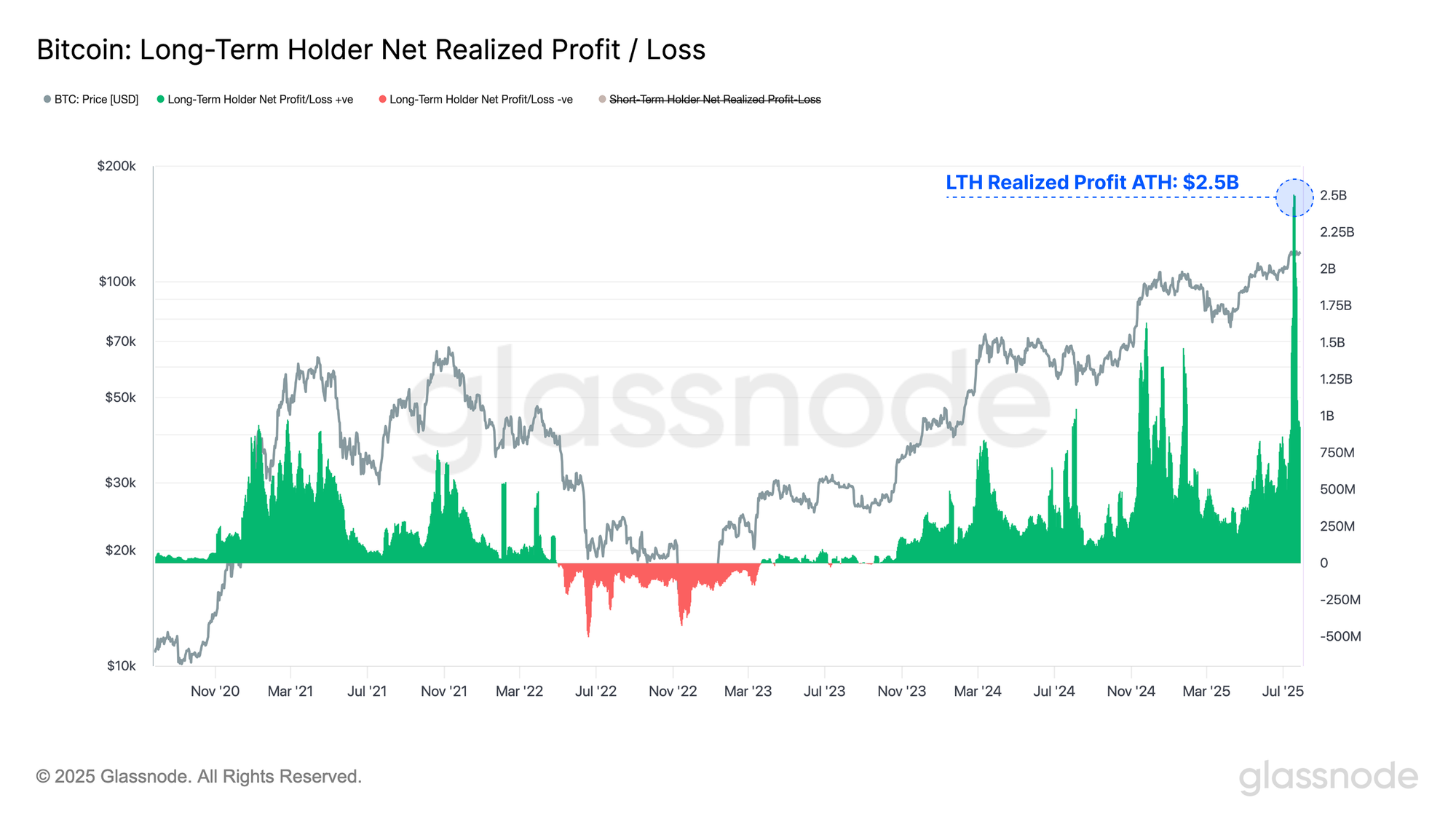Following the absorption of a substantial tranche of long-dormant coins, the Long-Term Holder Net Realized Profit/Loss has surged to a new all-time high of $2.5B, surpassing the previous peak of $1.6B. This marks the single largest sell-side pressure event in Bitcoin’s history, an immense liquidity stress test, yet the market has remained remarkably resilient, with price holding just below its all-time high.