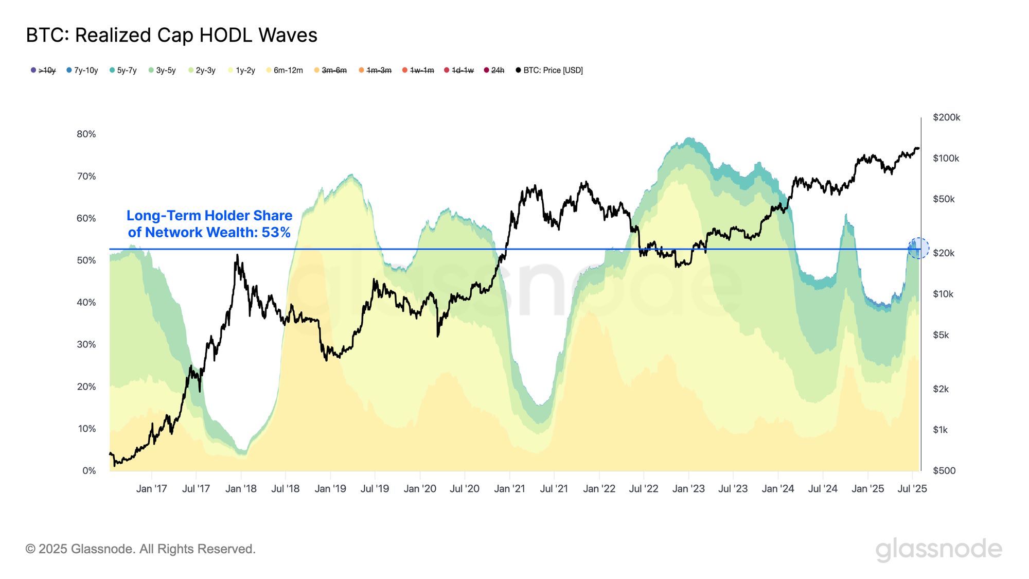 One notable differentiator in this cycle compared to previous ones is that Long-Term Holders still retain a substantial share of network wealth, currently sitting at 53%.