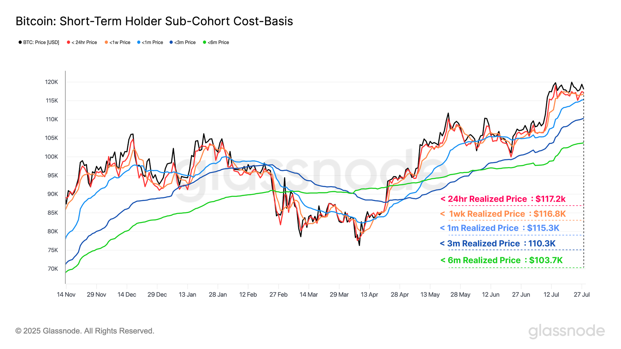 We can bolster our analysis of Short-Term Holder behavior by examining the cost basis of distinct sub-groups within the cohort. These sub-groups form a "fast-to-slow" ribbon of cost basis levels, effectively acting as a momentum-style indicator for short-term market sentiment.