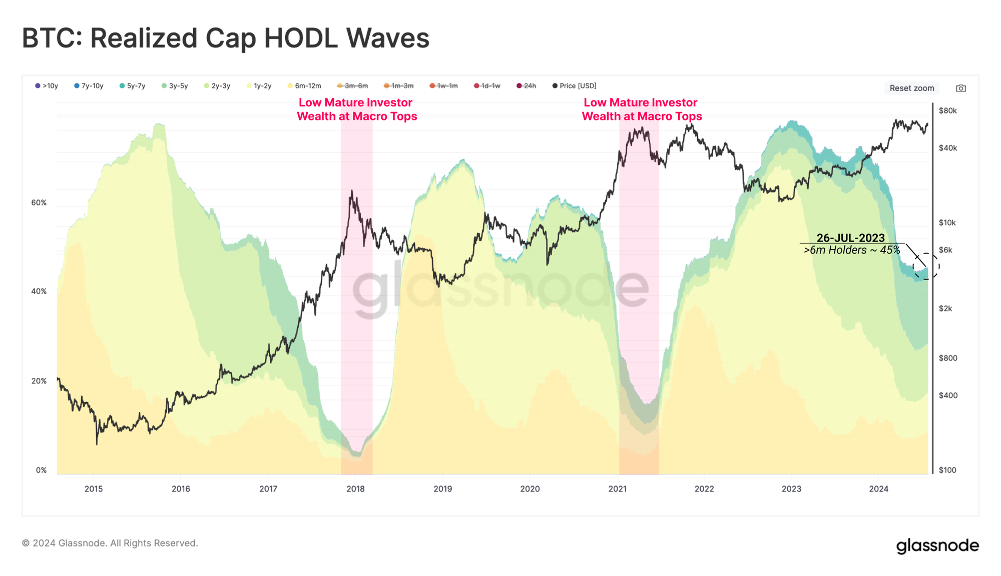 - The proportion of wealth held by new investors is declining, and is well below the levels typically witnessed at macro market tops. This highlights a general shift in investor behaviour back towards HODLing.