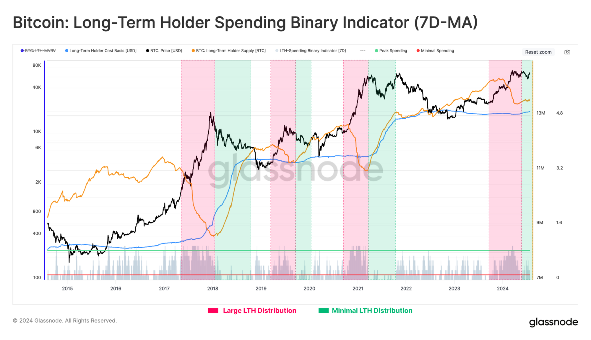 Finally, we can utilize the Long-Term Holder (LTH) Binary Spending Indicator to profile and visualize the intensity of HODLer distribution pressure.