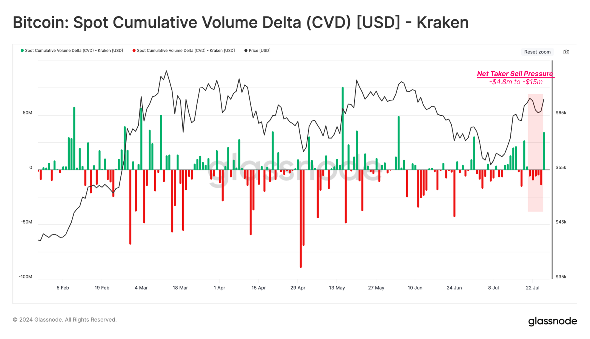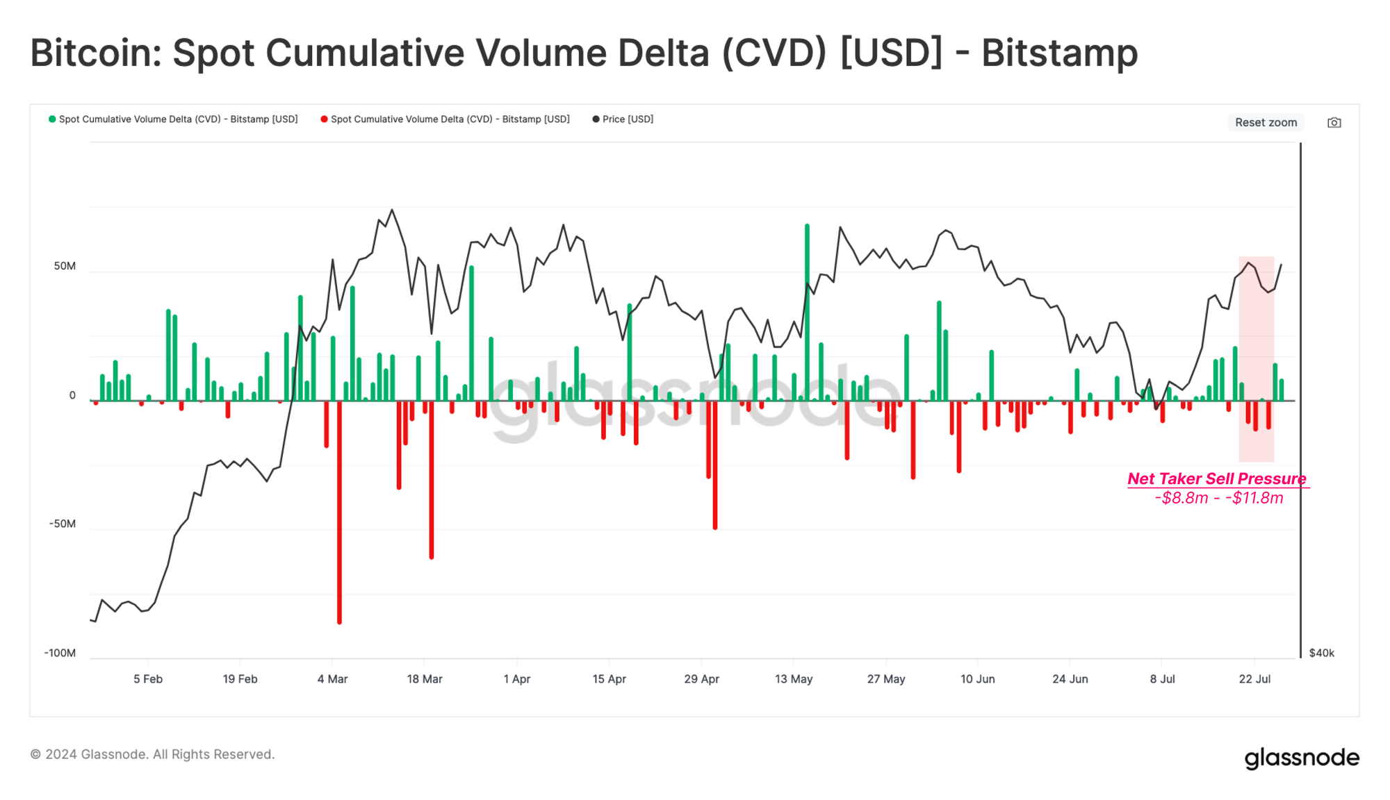 CVD measures the net difference between spot buying and selling trade volumes on centralized exchanges (market orders only).