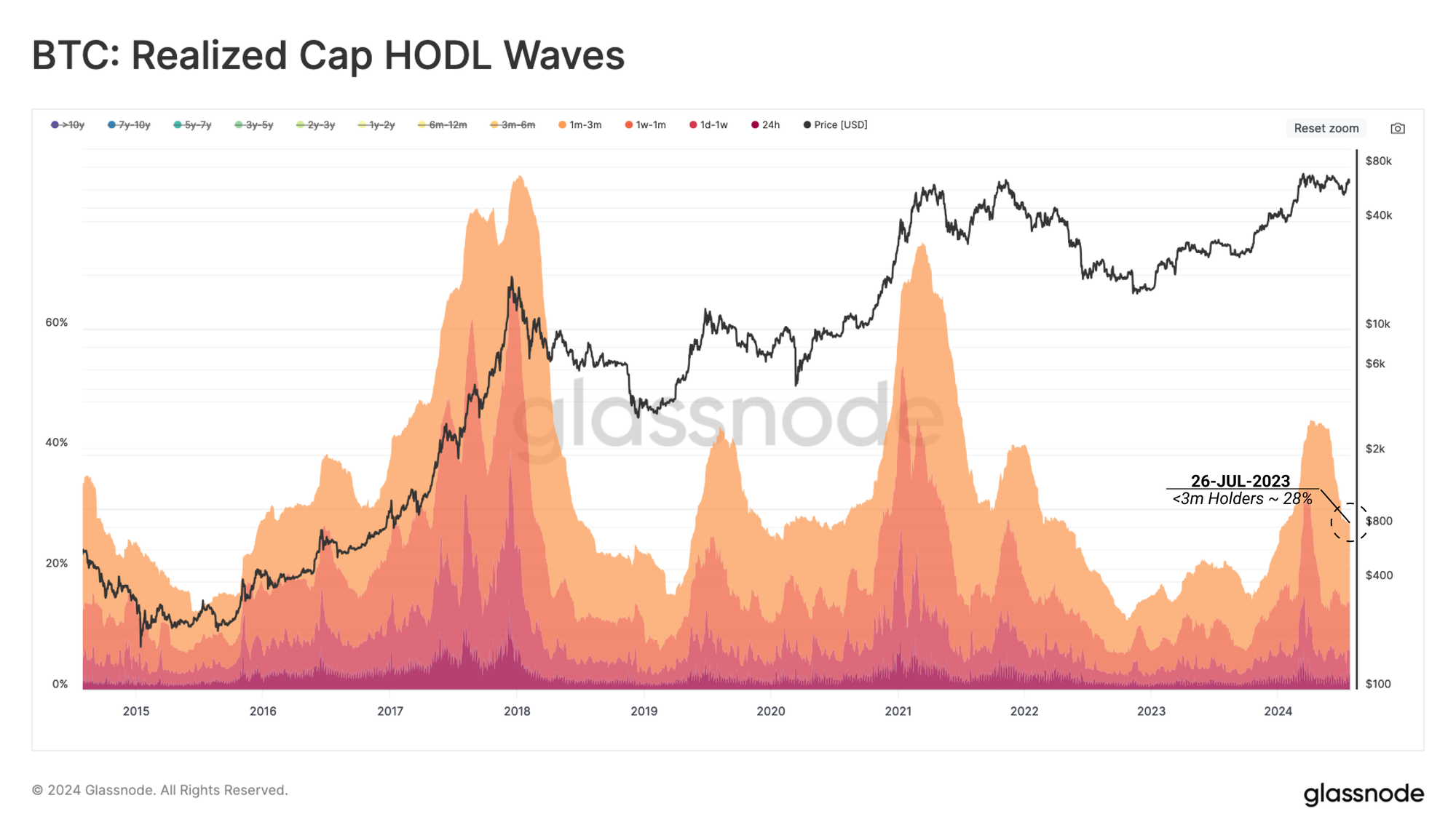 The Realized Cap HODL Wave metric helps us segregate the USD wealth locked in coins held for less than three months. This allows us to evaluate the waves of in-flowing demand by new investors