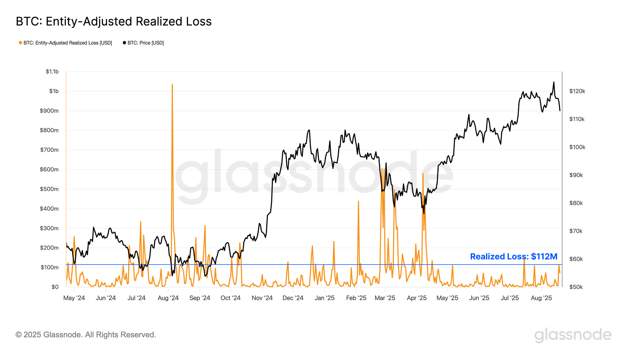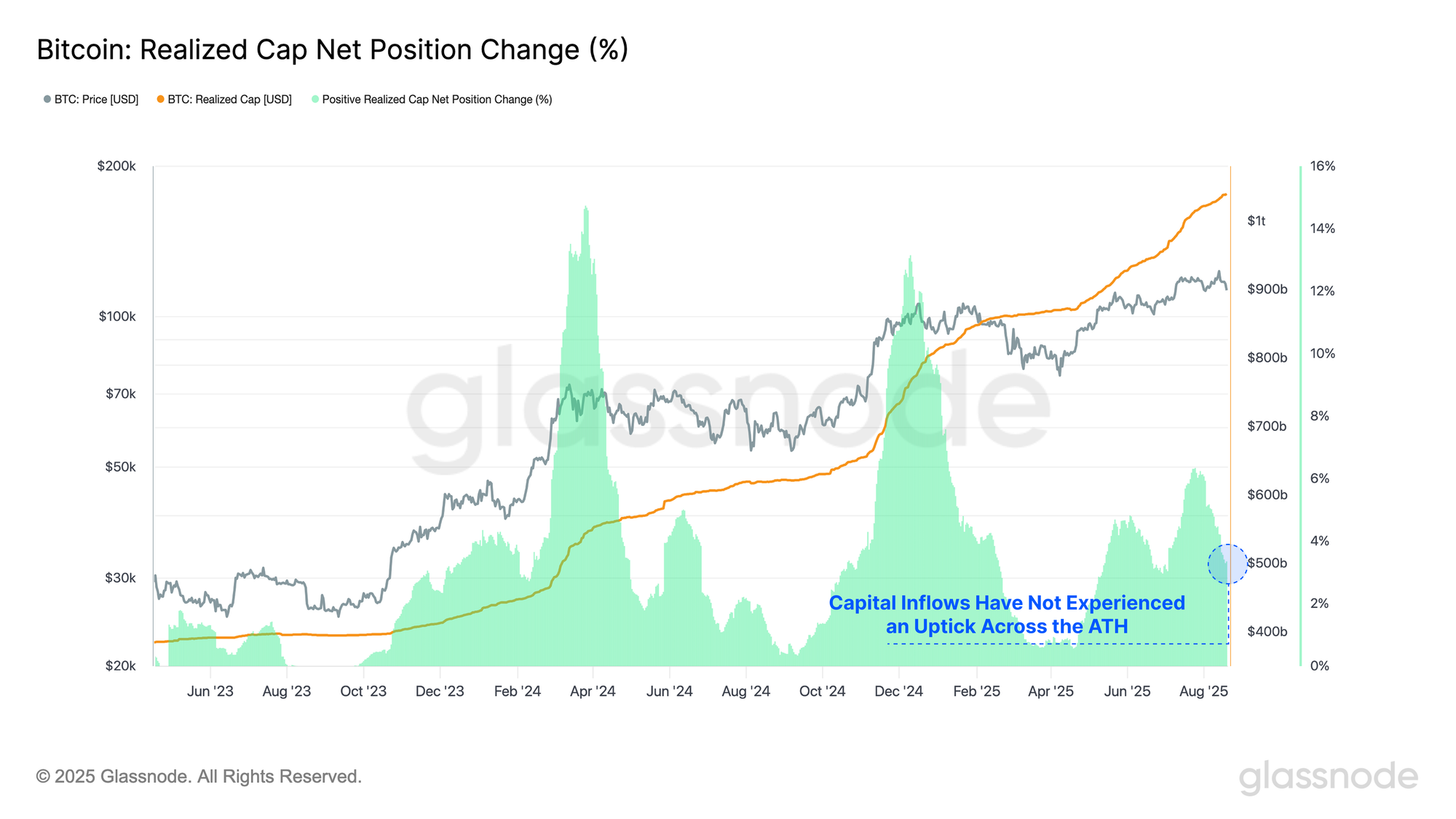 Following the formation of a $124.4K high last week, Bitcoin's upward momentum has stalled, with price retracing to a low of $112.9K, a near -9.2% pullback. This decline has been accompanied by noticeably weaker capital inflows over recent weeks, suggesting that investors were unwilling to inject fresh capital at those elevated price levels.