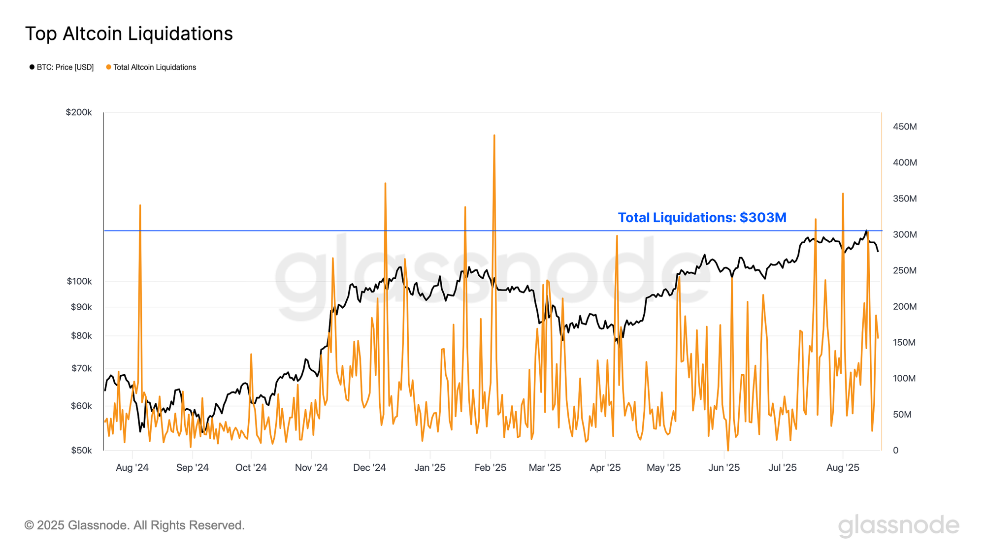 In addition, combined liquidations across the major altcoins have been quite elevated of late, reaching a peak of $303M/day, and experienced more than twice the liquidation volume compared to the Bitcoin futures market.