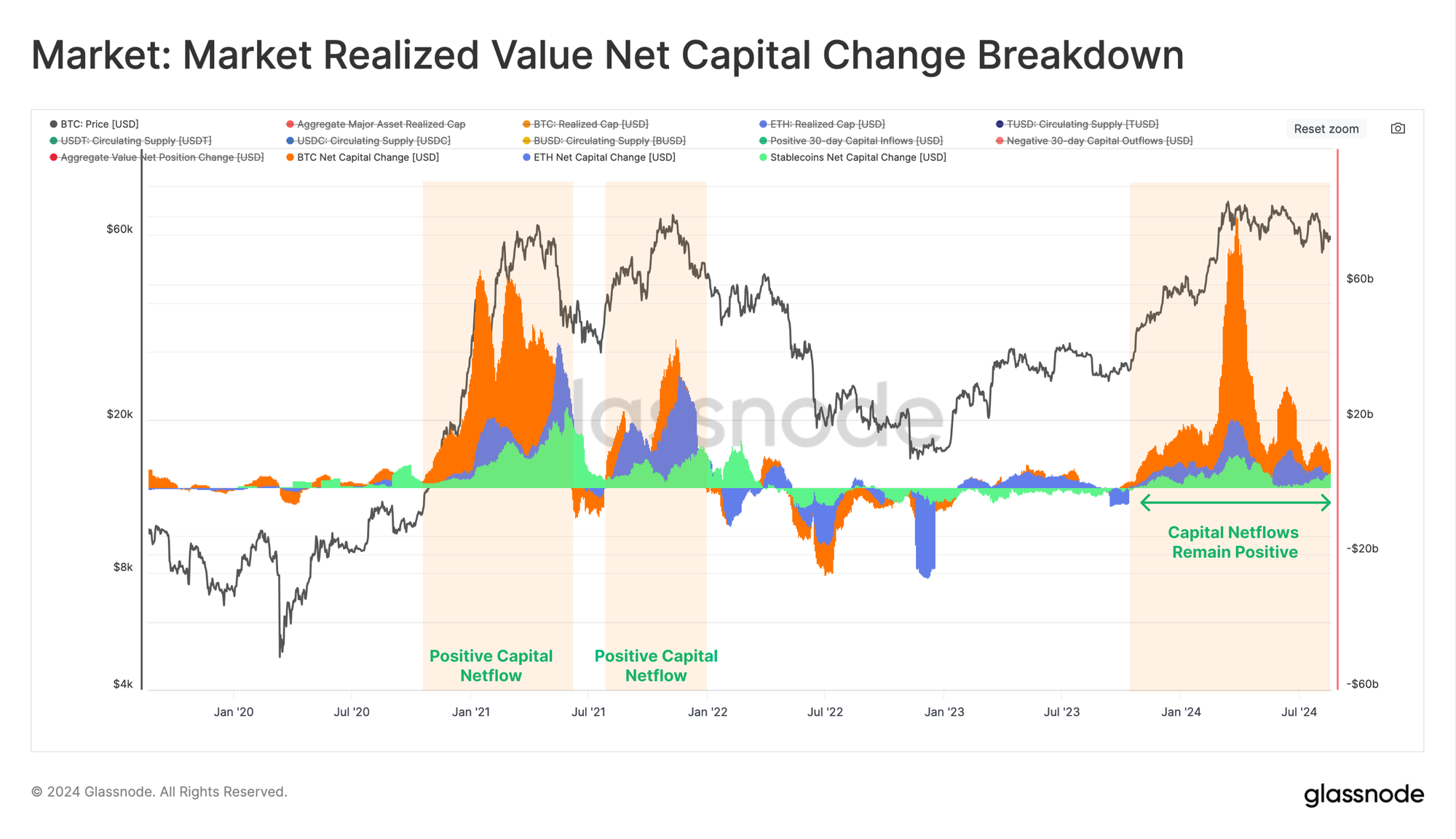 However, when we assess the Net Capital Change across the major assets, Bitcoin, Ethereum and Stablecoins exhibit a net positive capital inflow. Only 34% of trading days have seen a larger 30-day USD inflow, even though the market has generally contracted since the March ATH.