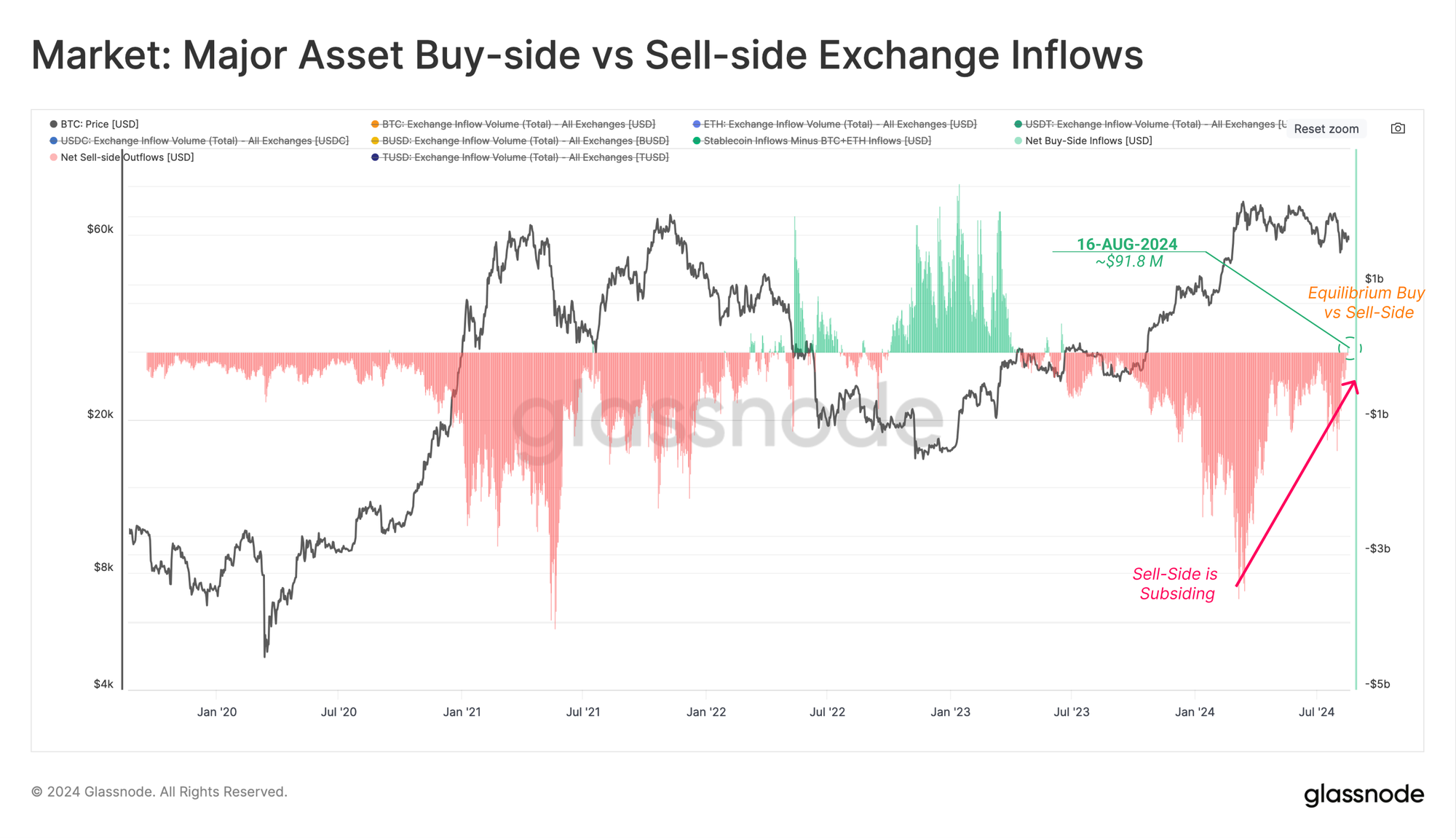 Next, we can utilize the Major Asset Buy-Side vs Sell-Side metric, which seeks to identify shifts in capital depending on the preference of exchange inflow volumes. This can be considered under the following framework: