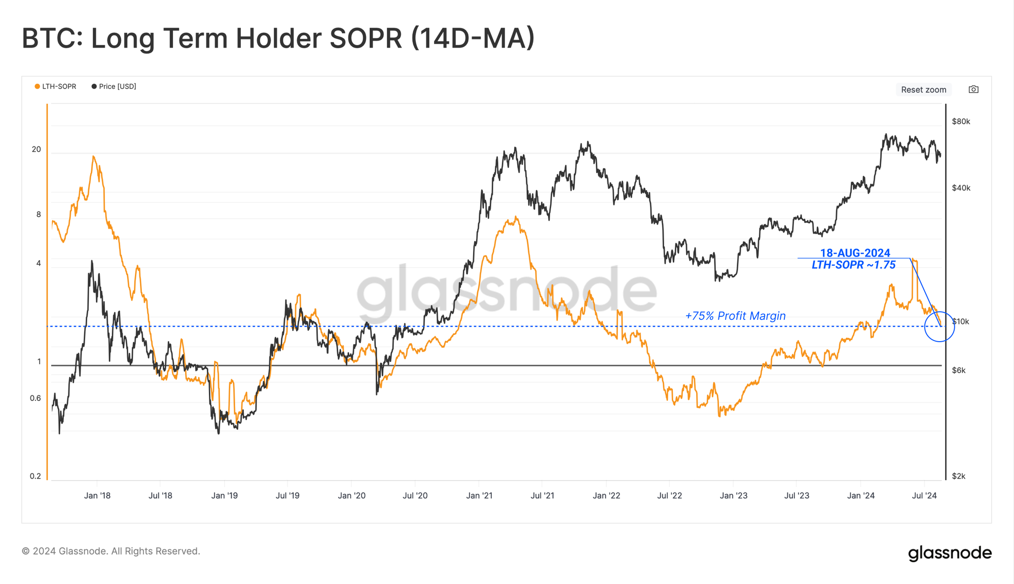 From the perspective of Long-Term Holder SOPR, we can see that coins are locking in an average profit margin of +75%, and LTH-SOPR remains elevated at this time.