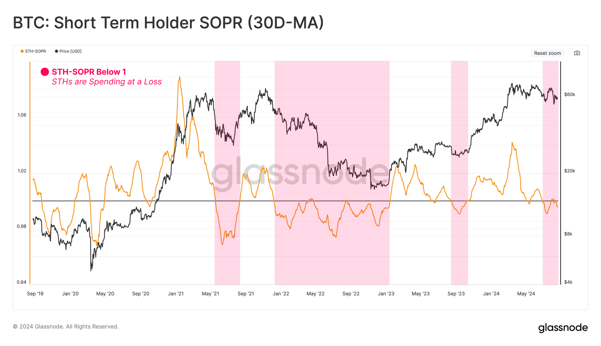 Evaluating the periods of high-loss realization in the market by new investors can be seen when STH-SOPR trades below 1.0.
