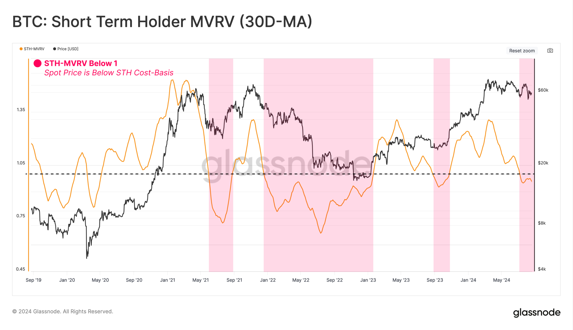 STH-MVRV has recently contracted below the equilibrium value of 1.0, suggesting that the average new investors now hold an unrealized loss.