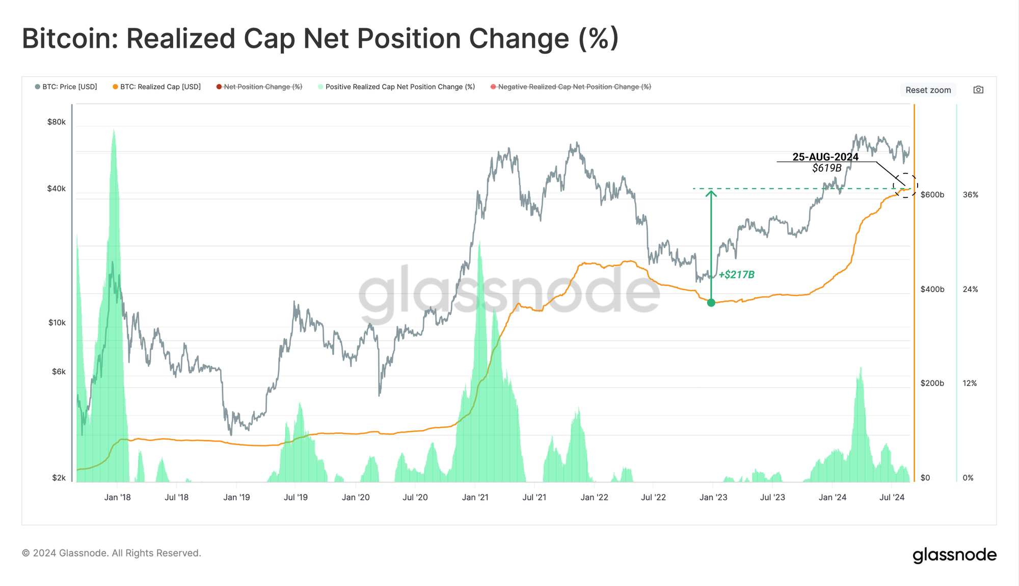 The Realized Cap remains at an ATH value of $619B, supported by a remarkable net inflow of $217B since the $15k low established in Dec 2022.