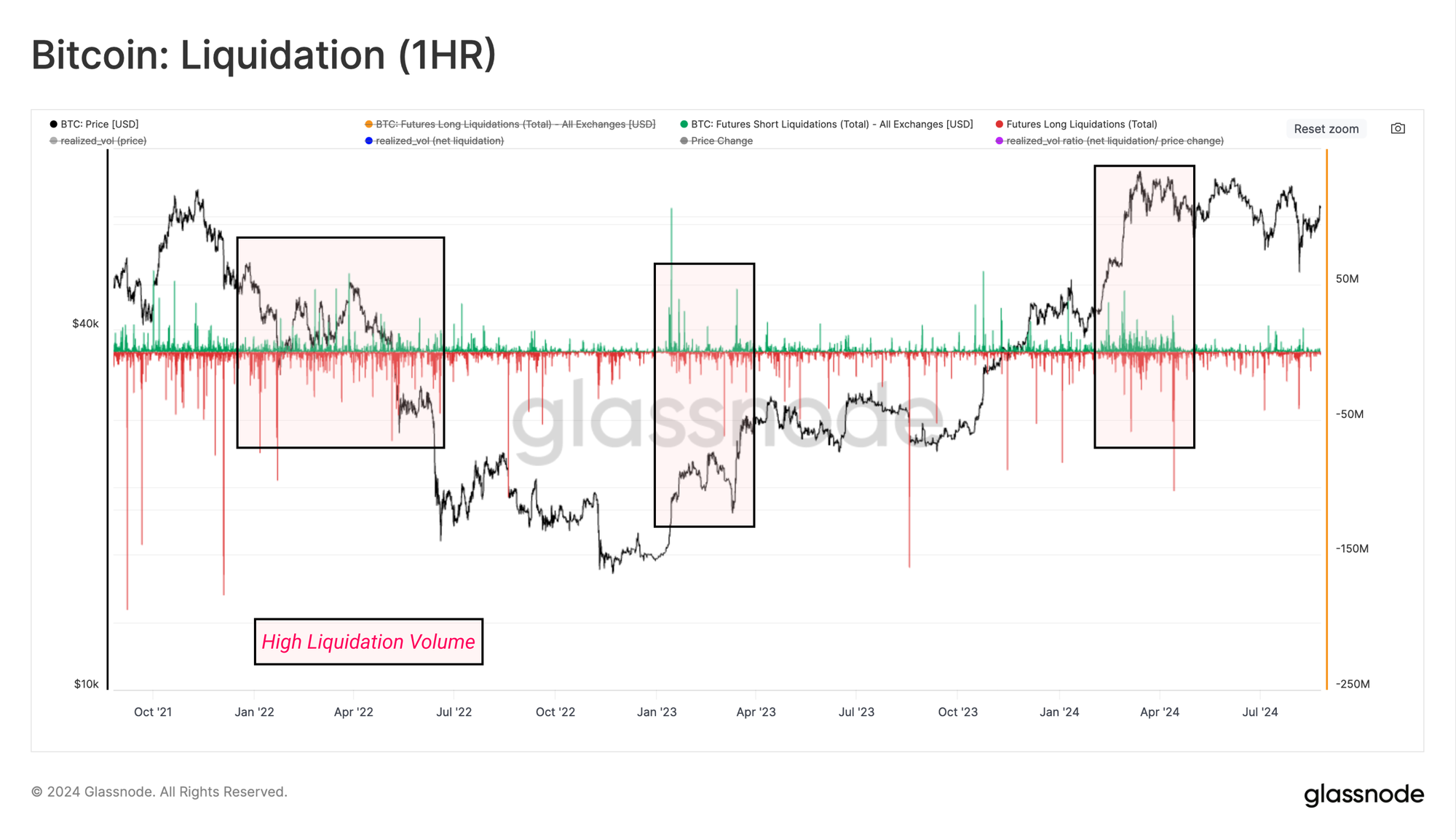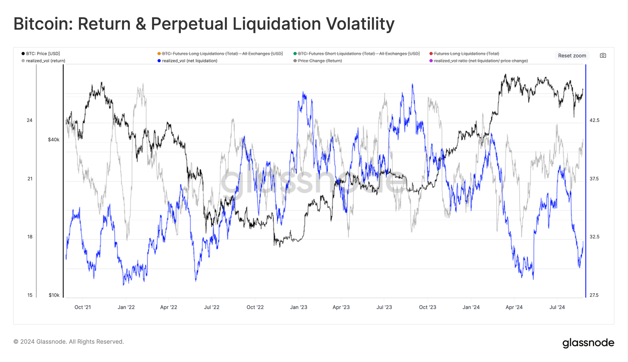 In general, there has been a marked decline in liquidation volumes in recent months, especially relative to the excitement around the March ATH. This suggests that the appetite for speculation has declined and suggests a more spot-dominated market regime for the time being.