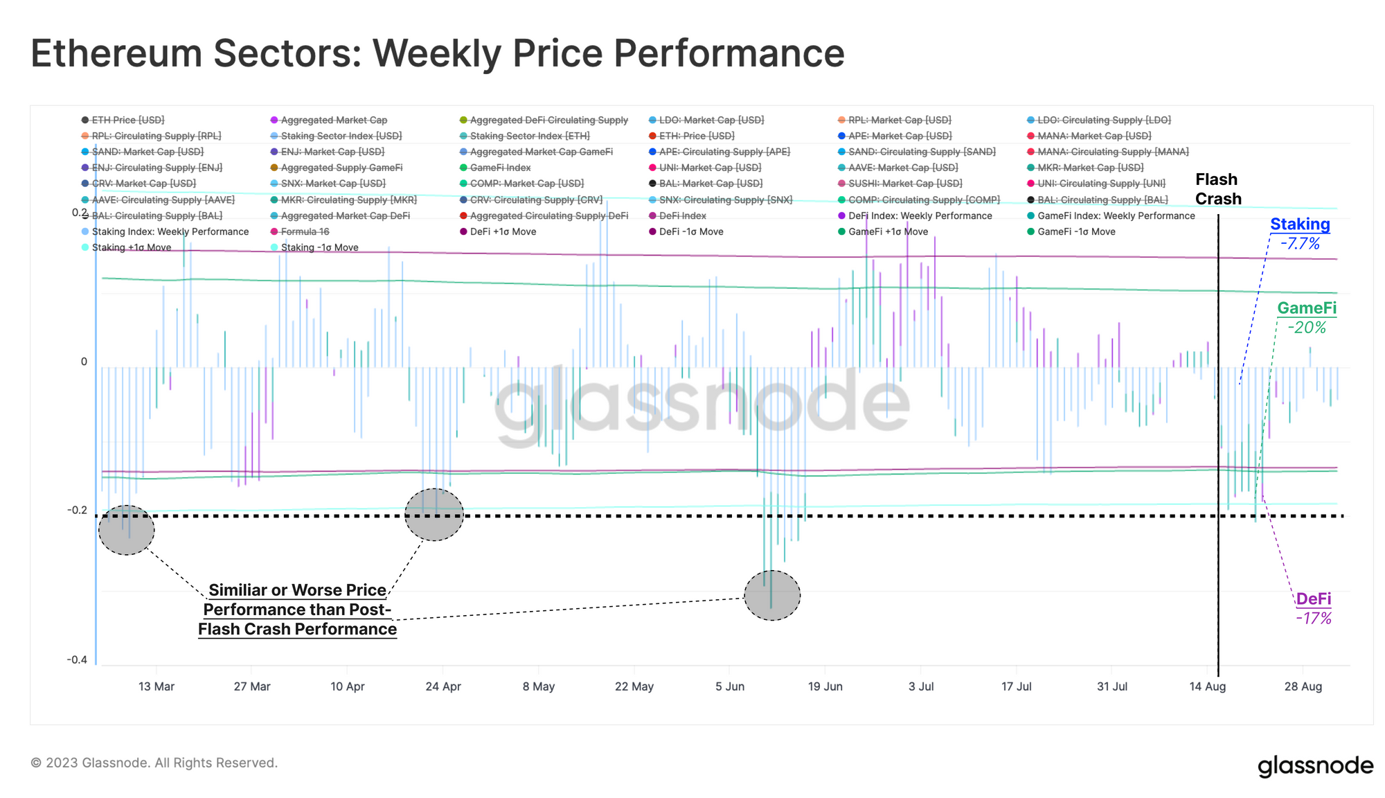 Within the Ethereum ecosystem, there has been a mixed reaction across indices for the DeFi, GameFi, and Staking sectors. Each index is constructed from the average supply-weighted price of 'Blue-Chip' tokens in the sector.