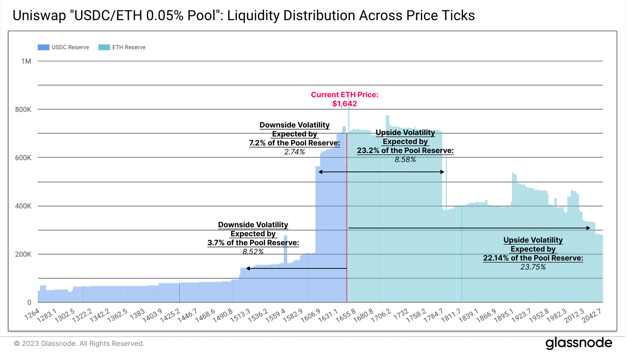 When examining the distribution of liquidity across different price ranges in the Uniswap pool, we can see that LPs are currently supplying a majority of liquidity above the current price tick.