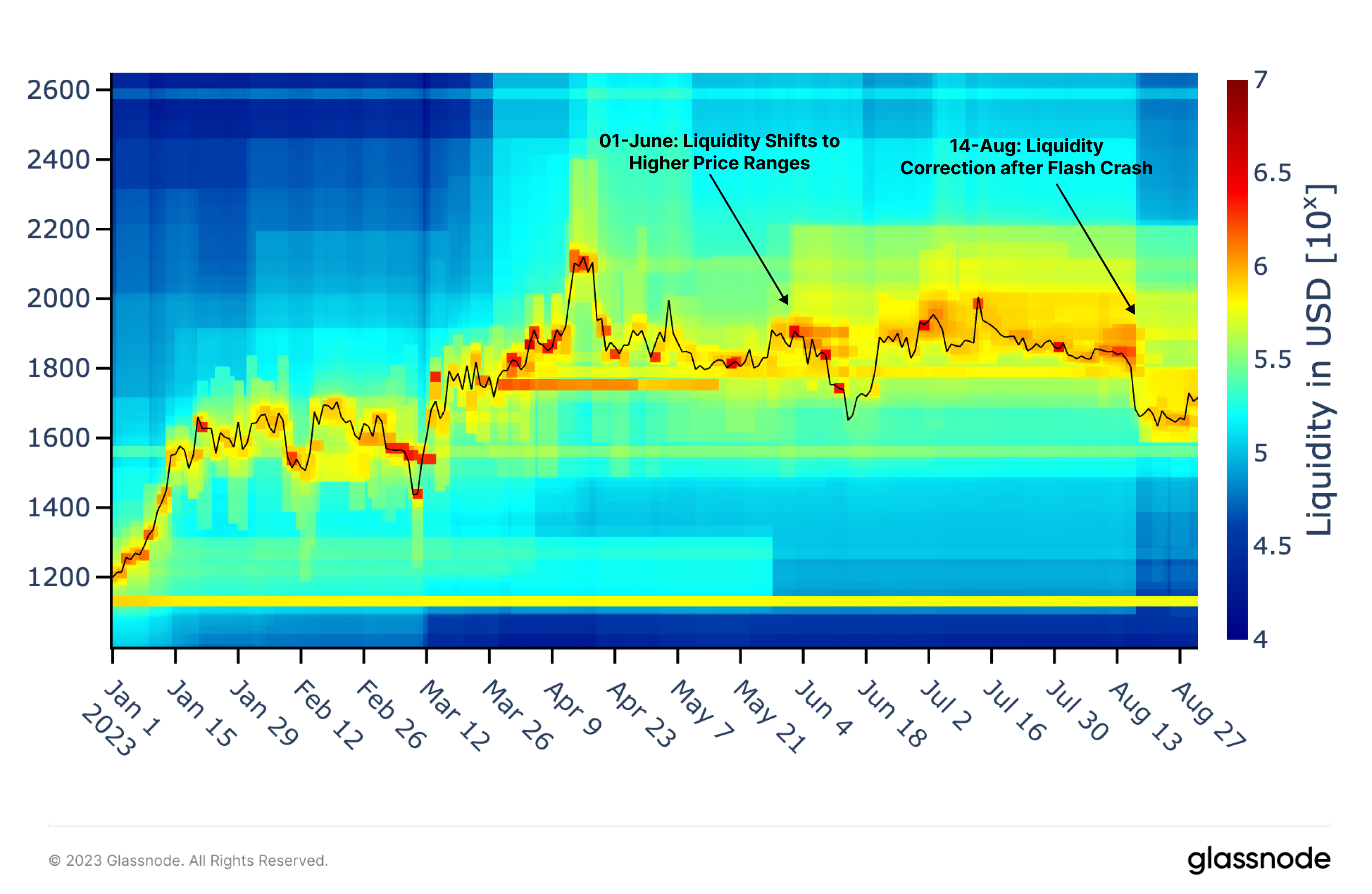 With the expansion of automated LP strategies and execution, liquidity providers have become quite successful in arranging liquidity very close the spot price during periods of higher volatility. On 1-June, a large amount of liquidity was expanded just above the price at that time (shown in by a deeper yellow zone). This arguably indicated an expectation for higher fee revenue in this zone by market makers. This liquidity prevailed until the flash crash in August, where liquidity concentrations were adjusted to be increasingly below the $1.8k. This chart provides a remarkable view into how responsive LPs are relative to market events and volatility.