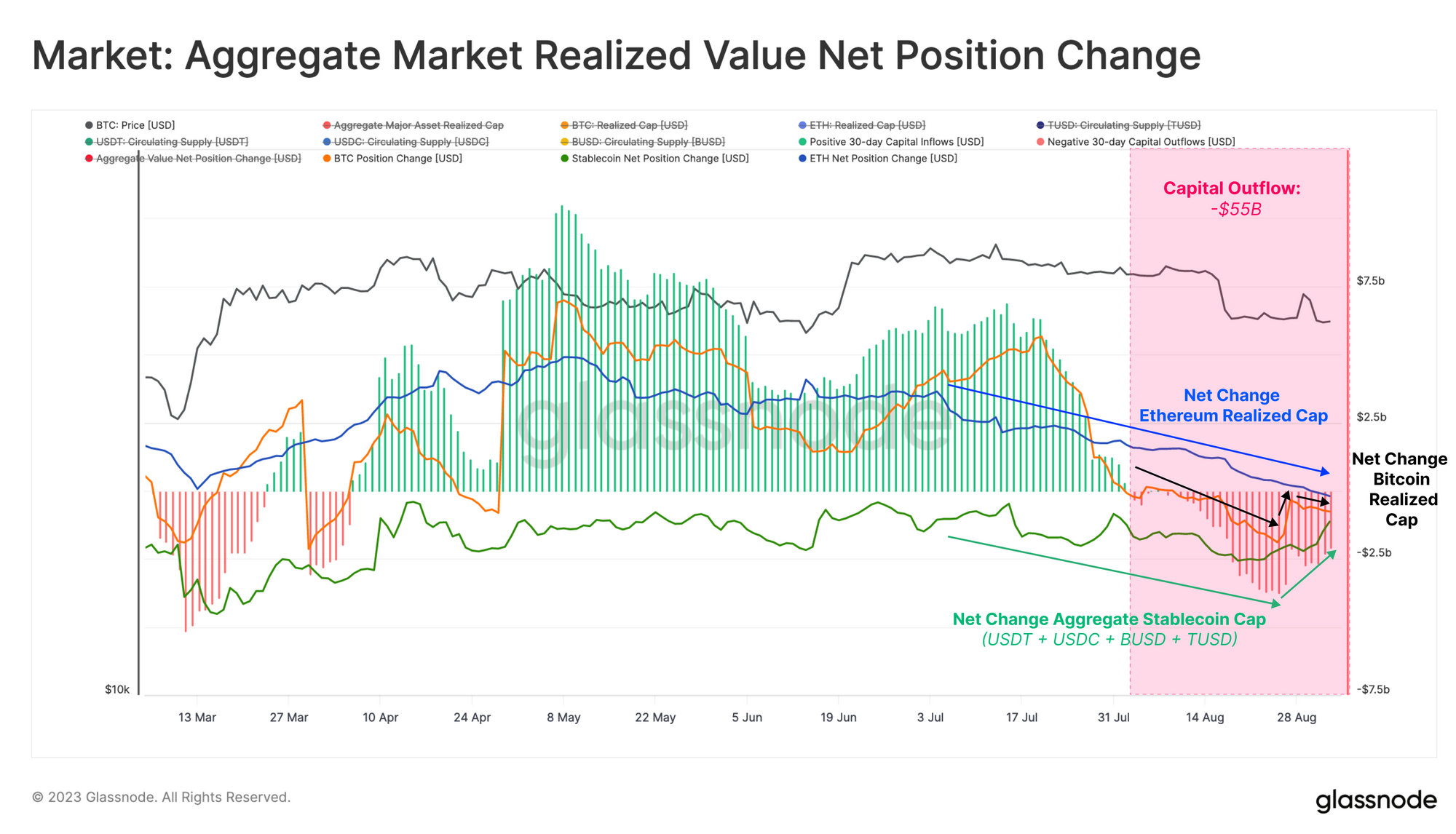 From this, it becomes clear that the market had entered a regime of capital outflow in early August, well before these two major events. Approximately $55B in capital has left the digital asset space through August.