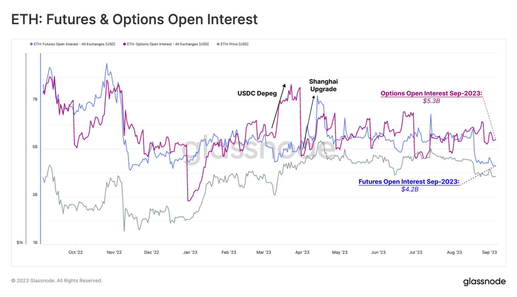 This trend is mirrored in derivatives Open Interest. Following the market lows set in the wake of the FTX collapse, Open Interest started to climb in early 2023. For Options, open interest peaked during the March banking crisis when USDC experienced a depeg from $1. Ethereum futures open interest peaked around the Shanghai Upgrade, suggesting this was the last major speculative event for the asset.