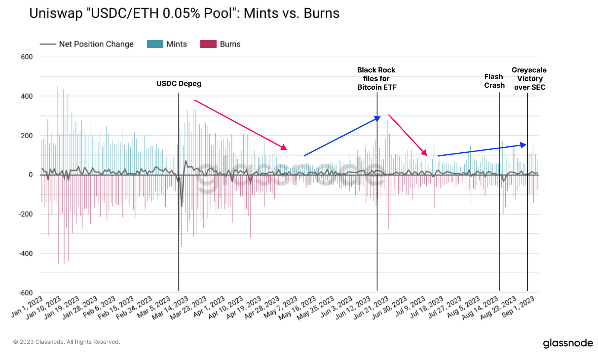 The chart below also shows the net change in LP position counts as a measure of the balance between positions opening and closing. We note that this metric is less affected by market trends but more so by discrete events suggesting short-term volatility is a key motivator.