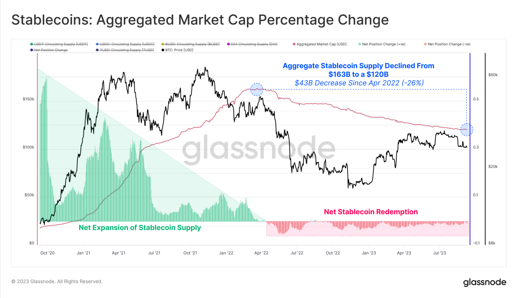 - 🟢 Stablecoins have experienced a persistent decline in supply since April 2022, as redemption commenced following the collapse of LUNA-UST.
