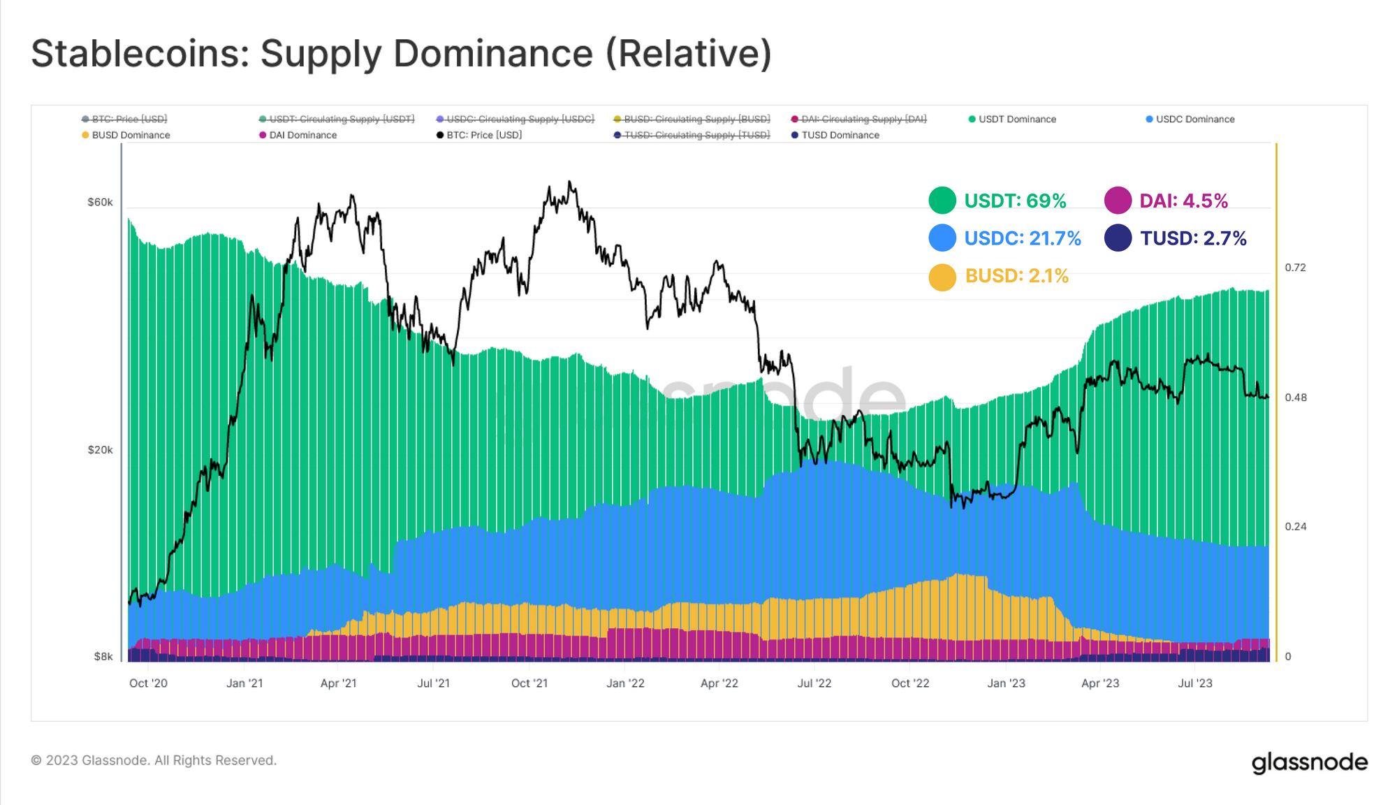 If we look at it through the lends of relative dominance, we can see just how significant the expansion of Tether's market share is. USDT now represents 69% of the stablecoin market, a stark reversal from the 44% low in dominance hit in June 2022.